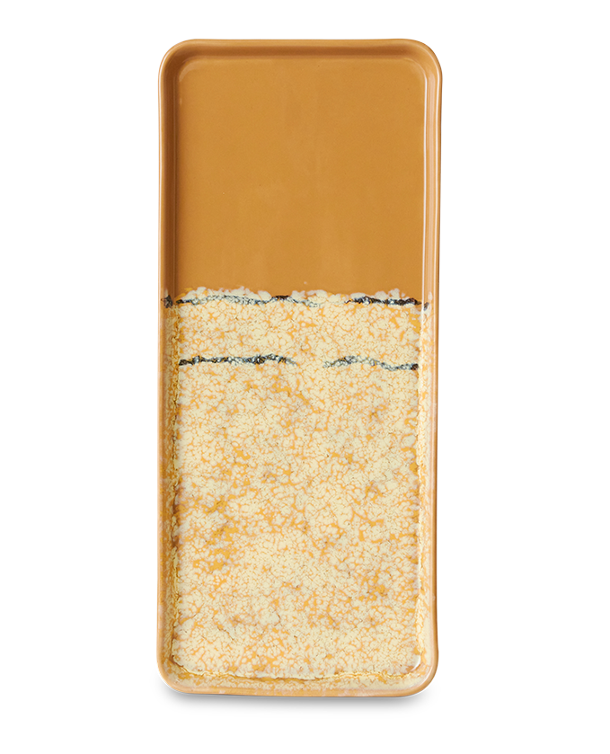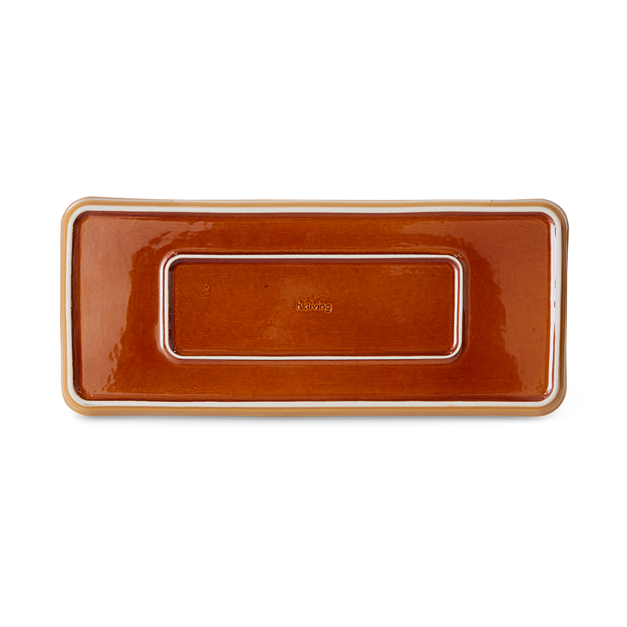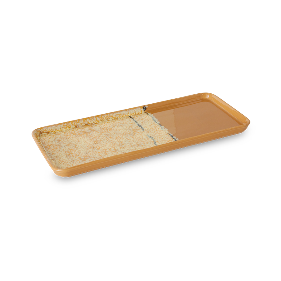Met een mix van aardse tinten en een glanzende afwerking brengt deze schaal flair op uw tafel. De langwerpige vorm is perfect voor het presenteren van taarten, gebak of hapjes, terwijl de verhoogde randen alles stevig op zijn plaats houden.