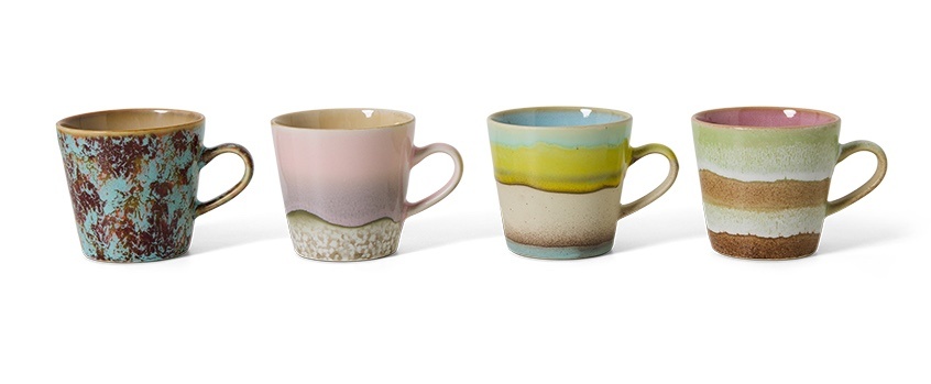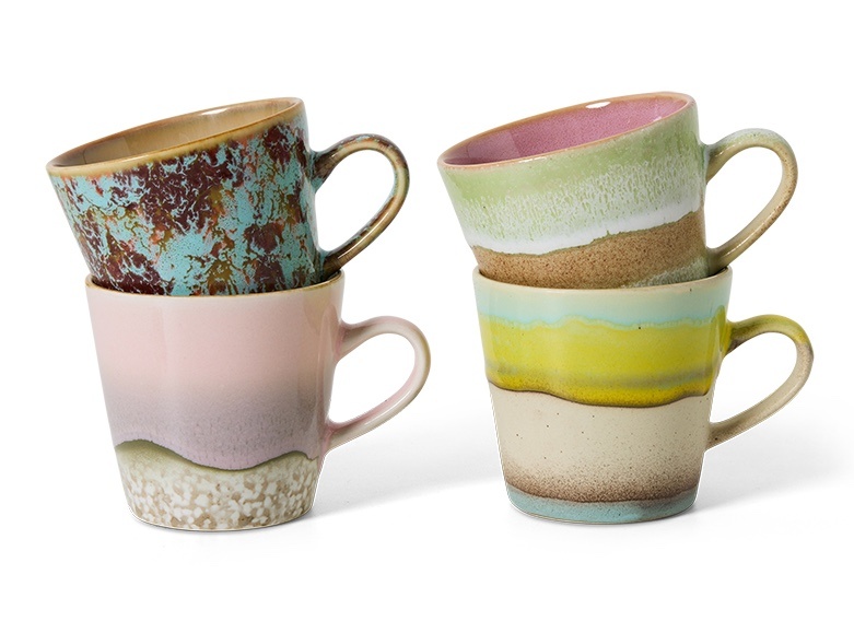 De HKLiving 70s ceramics americano mokken rococo zijn een ode aan kunststromingen als popart, surrealisme en expressionisme. Elk mokje heeft een eigen textuur en glazuurlaag, waardoor de set tegelijk speels en stijlvol oogt.