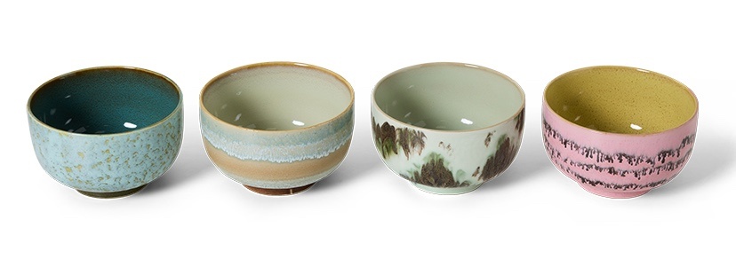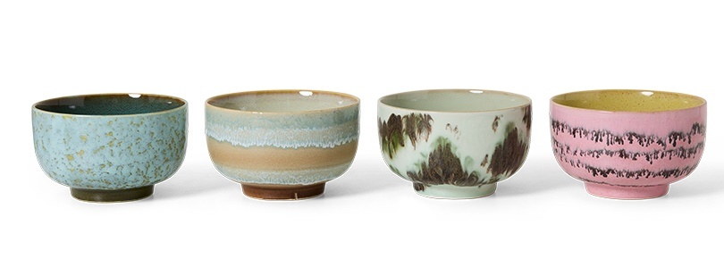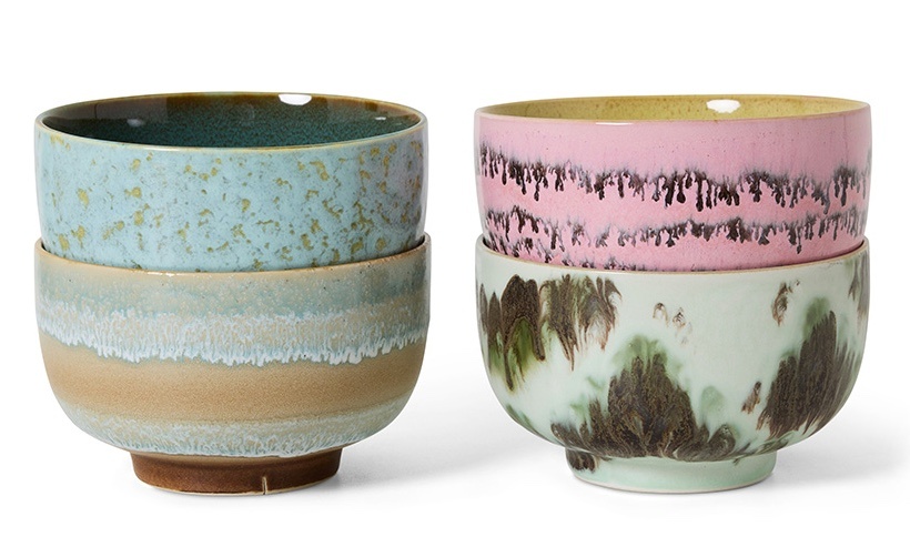 Elke kom uit deze set van vier is uniek afgewerkt met handgemaakte glazuren, geïnspireerd op de kunststromingen van de jaren ’70. Zo haal je niet alleen functionele, maar ook stijlvolle designstukken in huis.