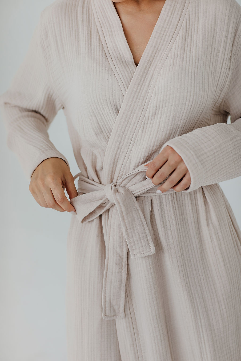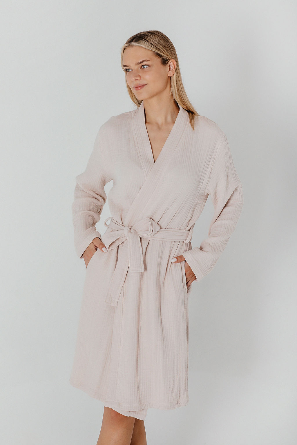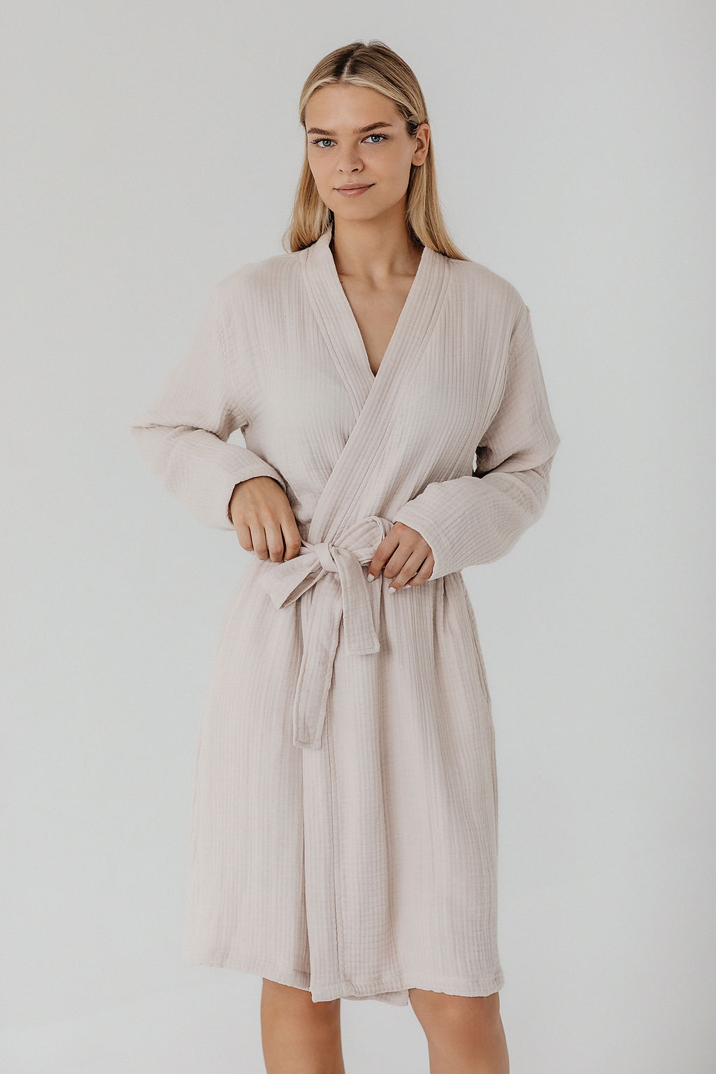 duurzaam en gemakkelijk in onderhoud: gemaakt van hoogwaardige tetra mousseline stof, is deze badjas machinewasbaar op 40°. Houd er rekening mee dat de badjas in de droger kan krimpen met ongeveer 5%, wat gebruikelijk is voor deze stof.
