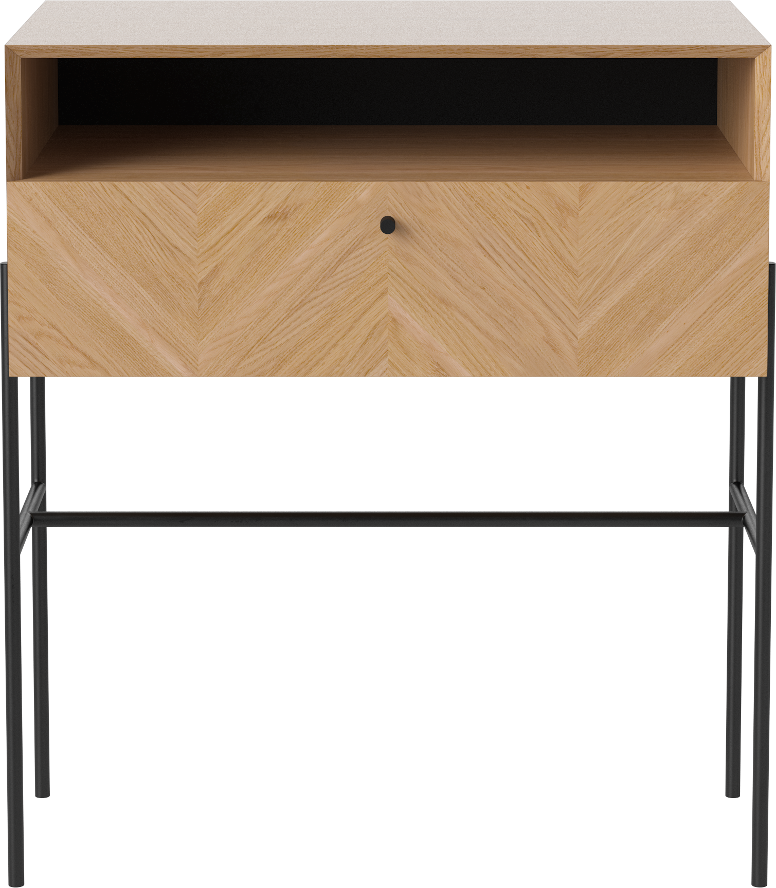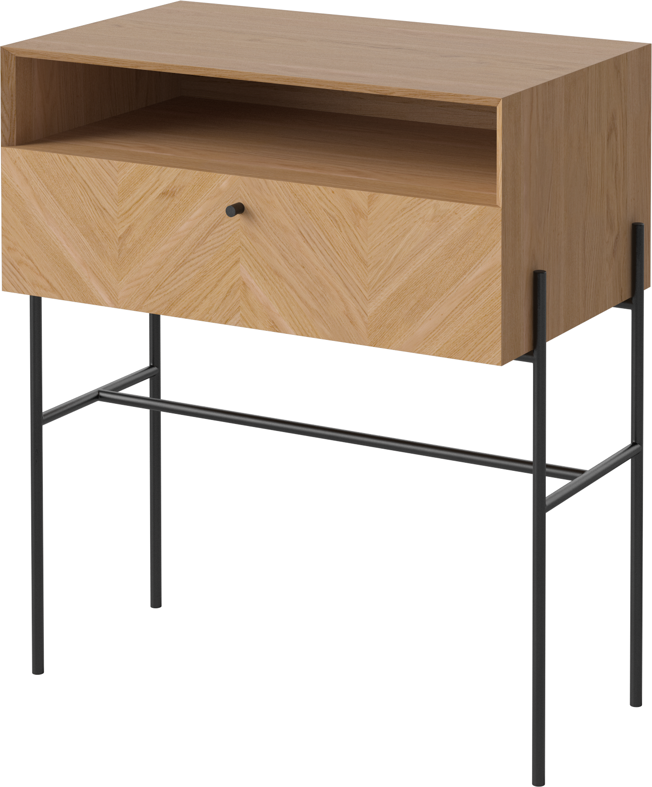 | Materiaal | ▪ De dressoir is gemaakt van fineerhout met eikenhout toplaag, afgewerkt in een elegant visgraatpatroon. ▪ De ladegeleiders en pootjes zijn uit metaal, wat zorgt voor stabiliteit en een moderne afwerking. |