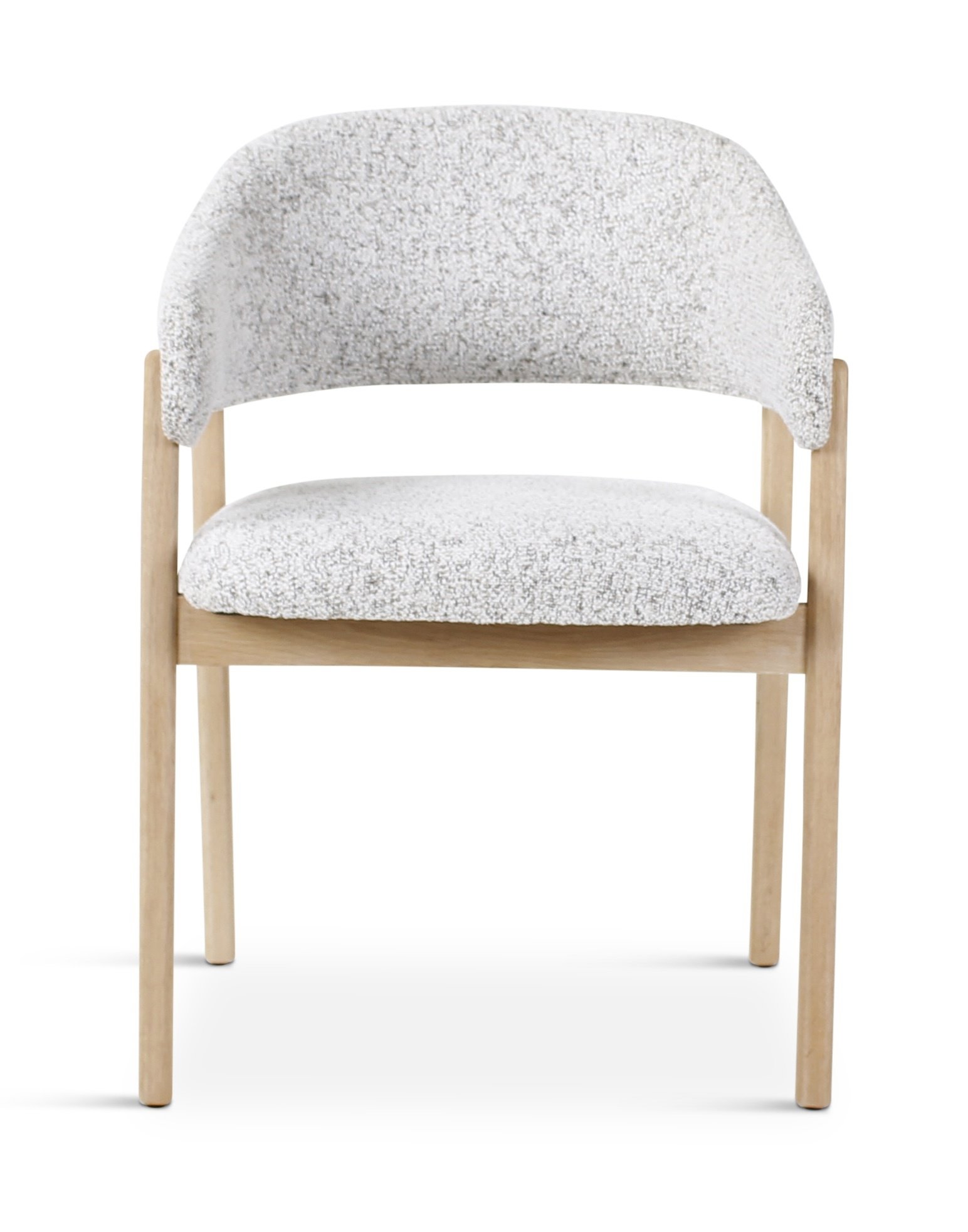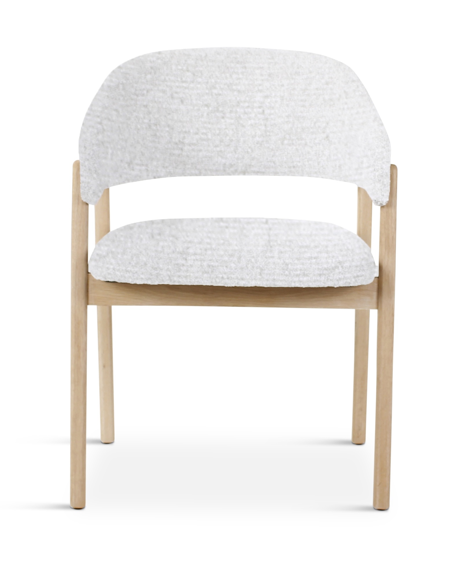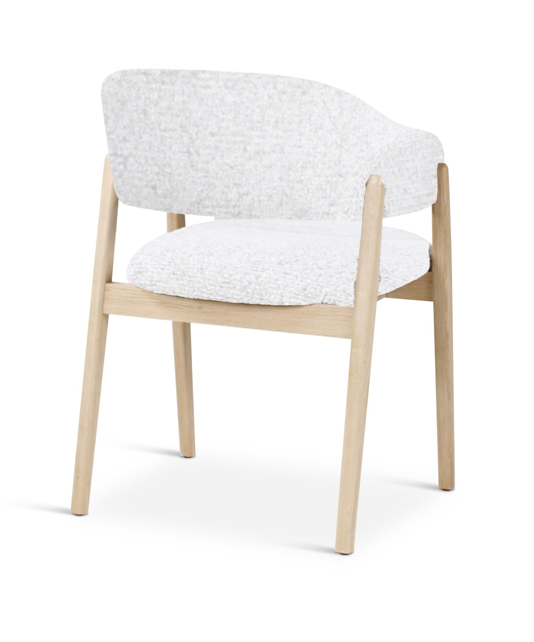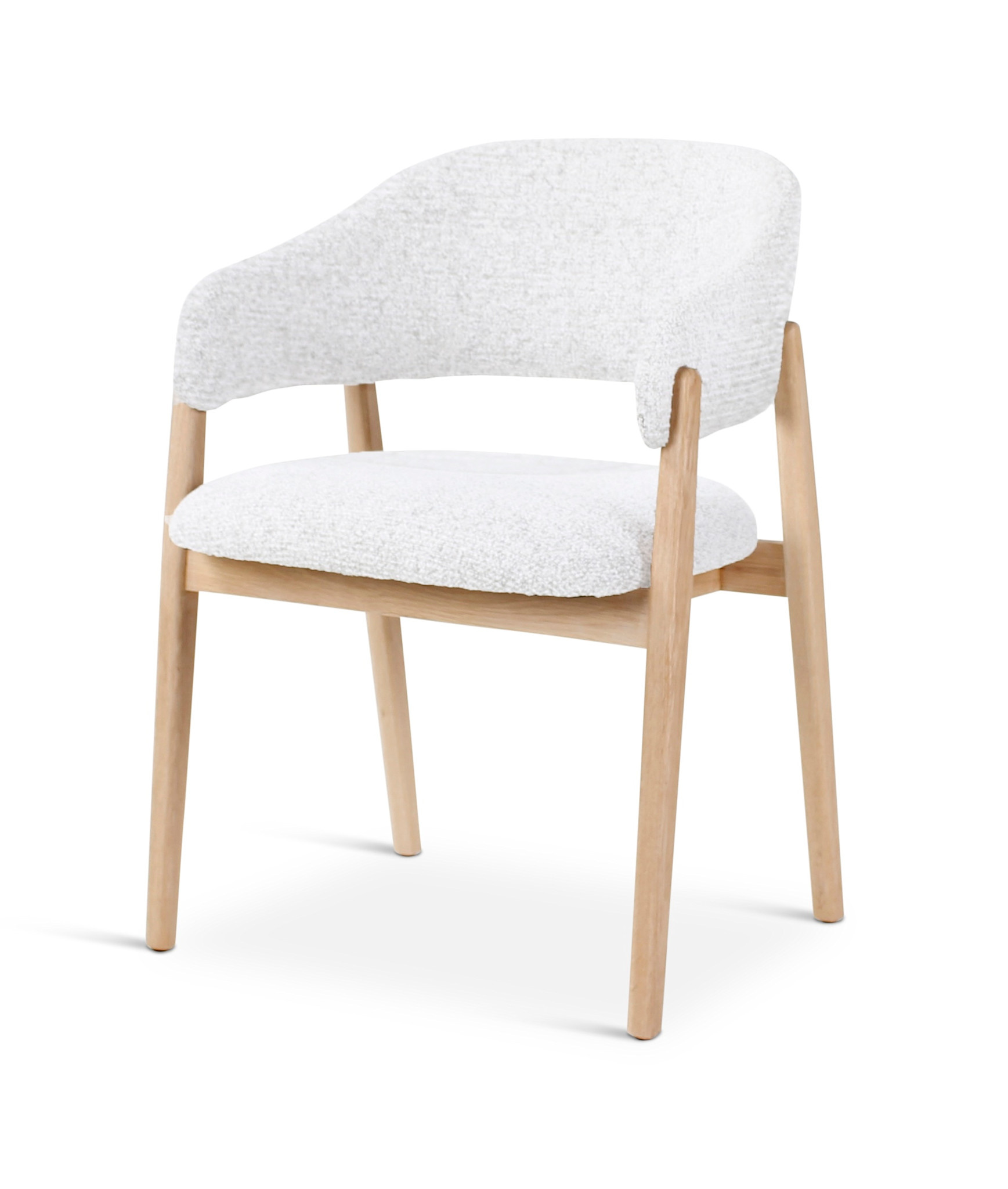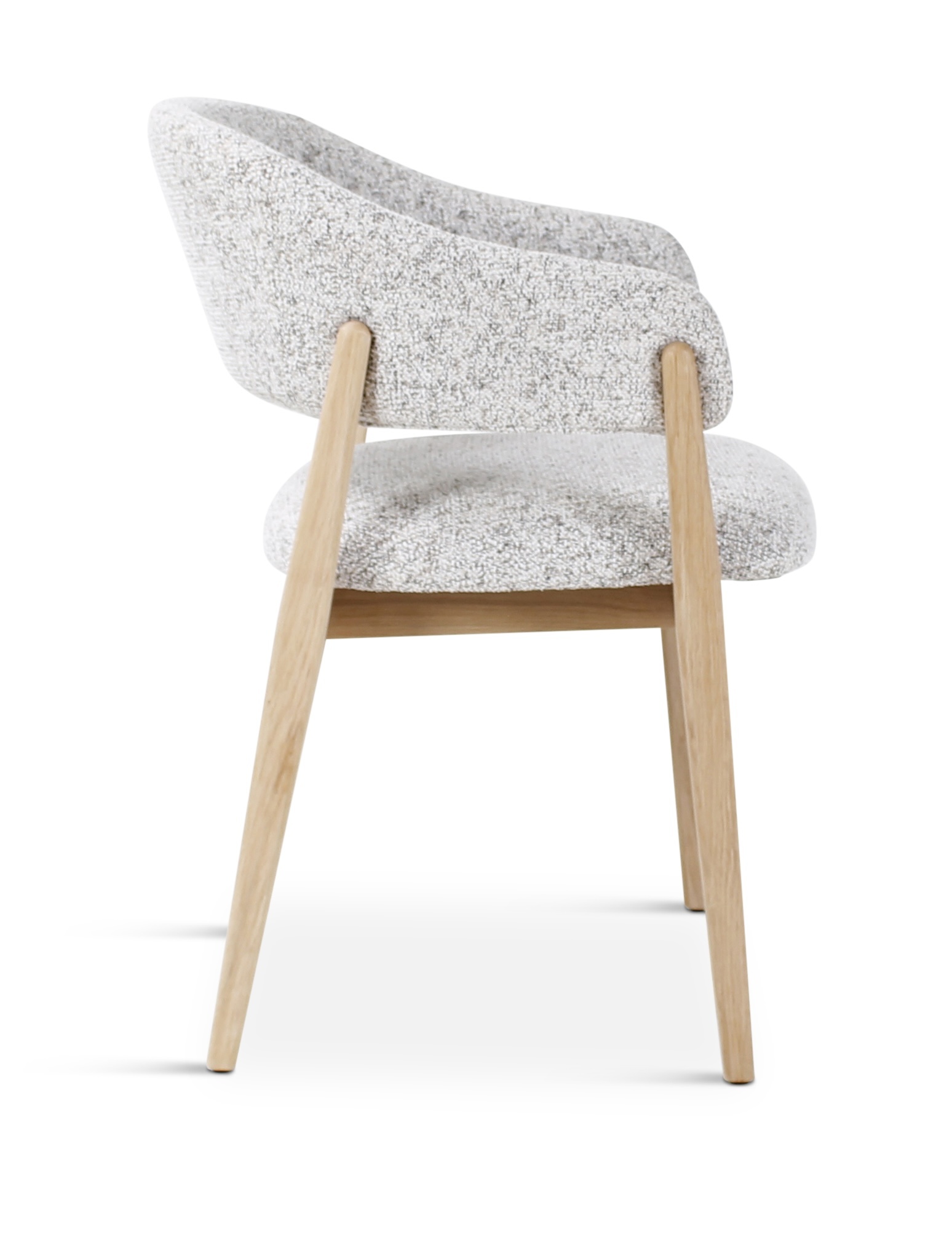 De combinatie van massief eikenhout in naturel en de ivoorkleurige bekleding zorgt voor een warme, rustige uitstraling. Het lichte onderstel en de afgeronde vormen geven de stoel een hedendaagse look zonder aan comfort in te boeten.