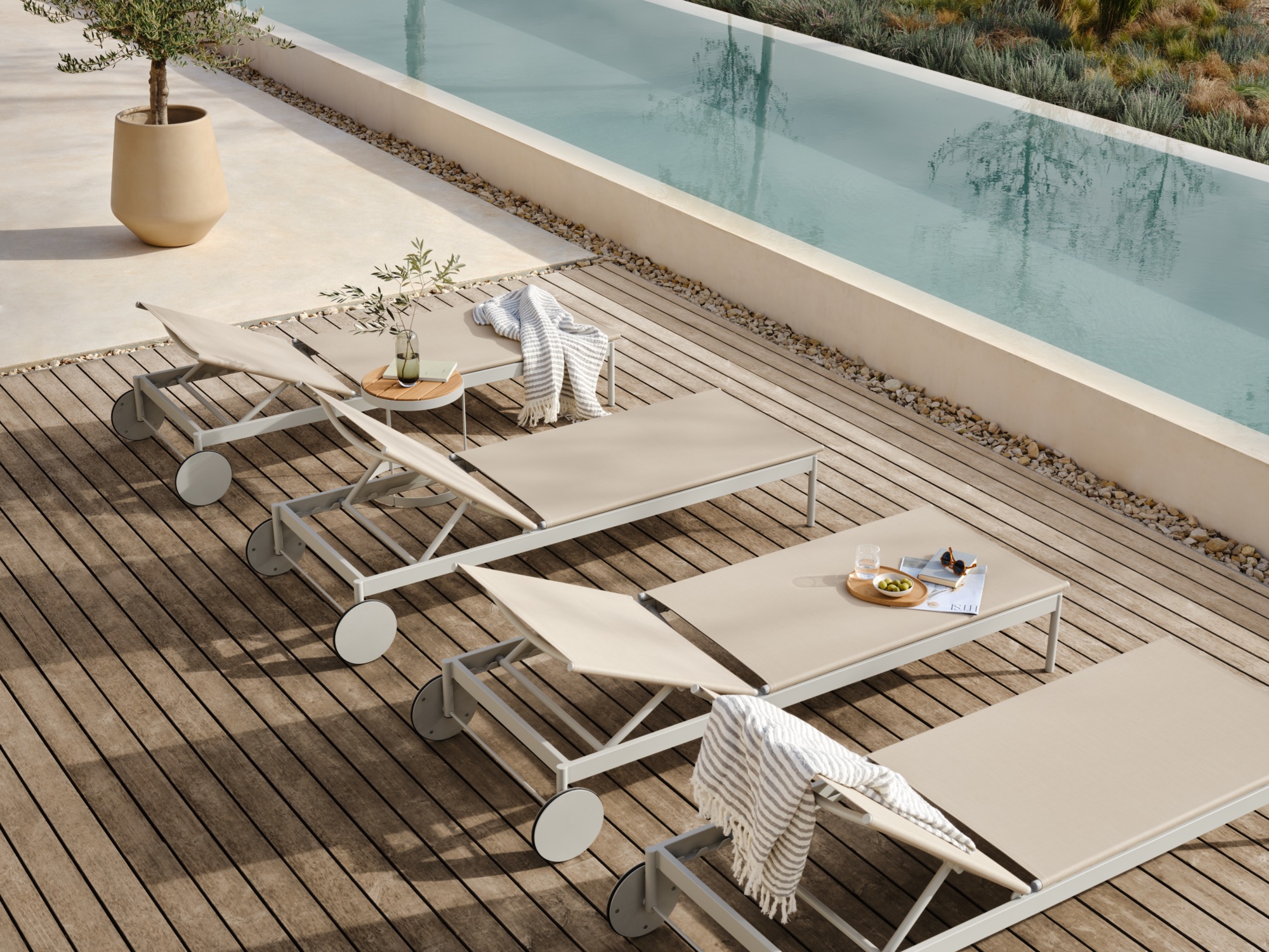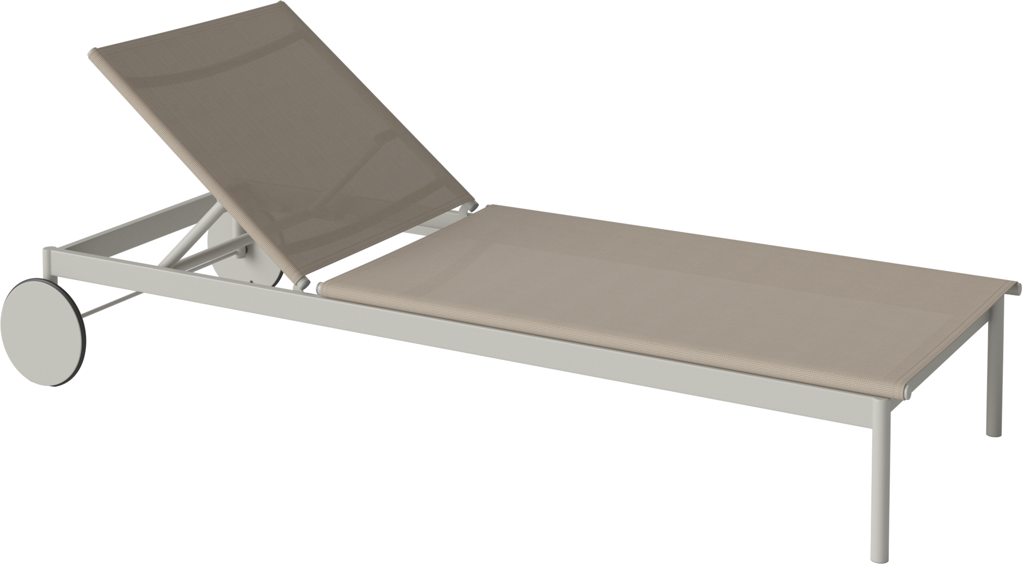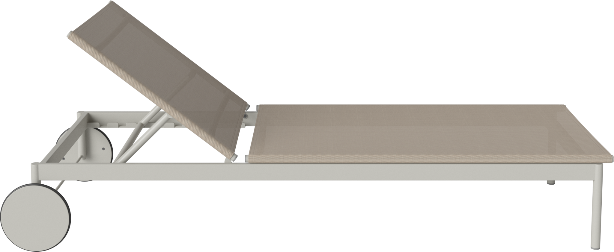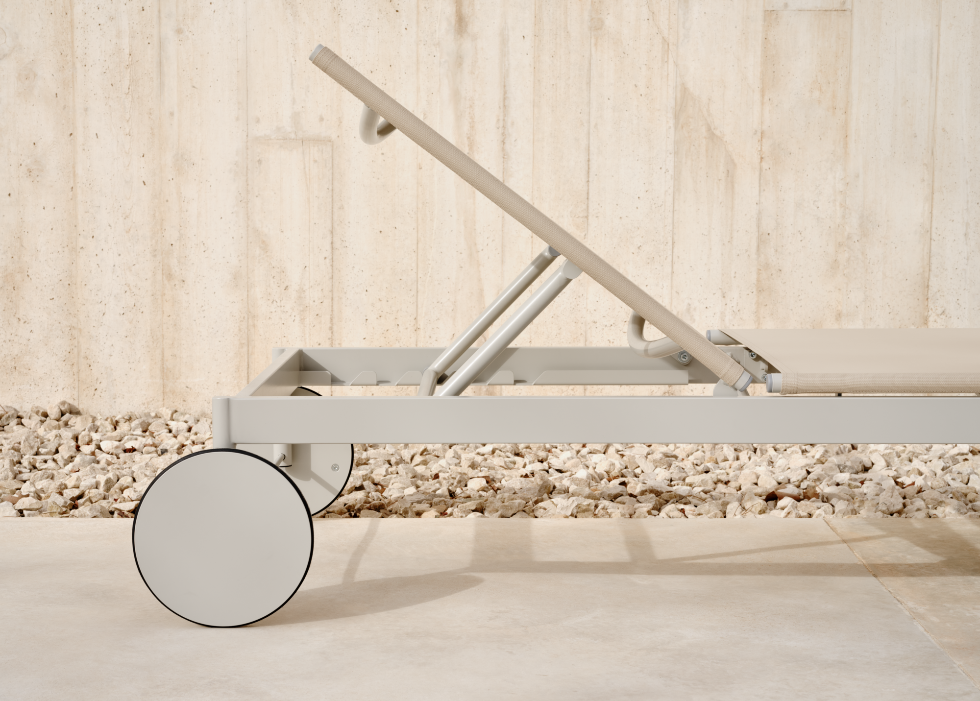 Materiaal | Het Ease zonnebed is vervaardigd uit duurzaam zandkleurig textiel, speciaal ontwikkeld voor buitengebruik en bestand tegen dagelijkse slijtage. |