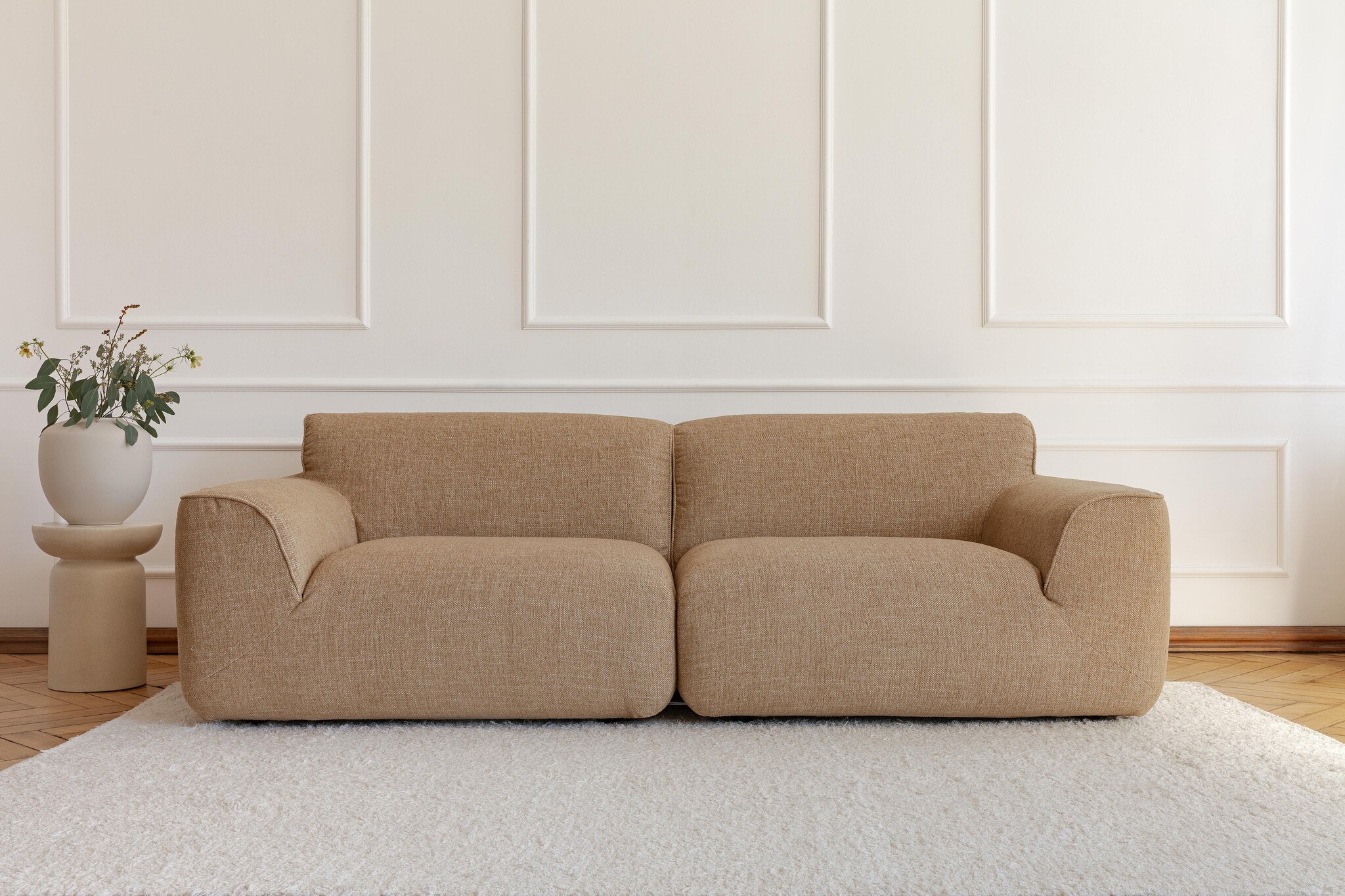 Emily is ontworpen als een sofa die rust brengt. De licht gebogen zit en zachte belijning zorgen voor een uitnodigende uitstraling, terwijl het standaard zitcomfort voldoende ondersteuning biedt voor dagelijks gebruik. Deze tweezit bestaat uit twee modules — één met armleuning links en één rechtermodule — die samen een royale maar evenwichtige zithoek vormen.