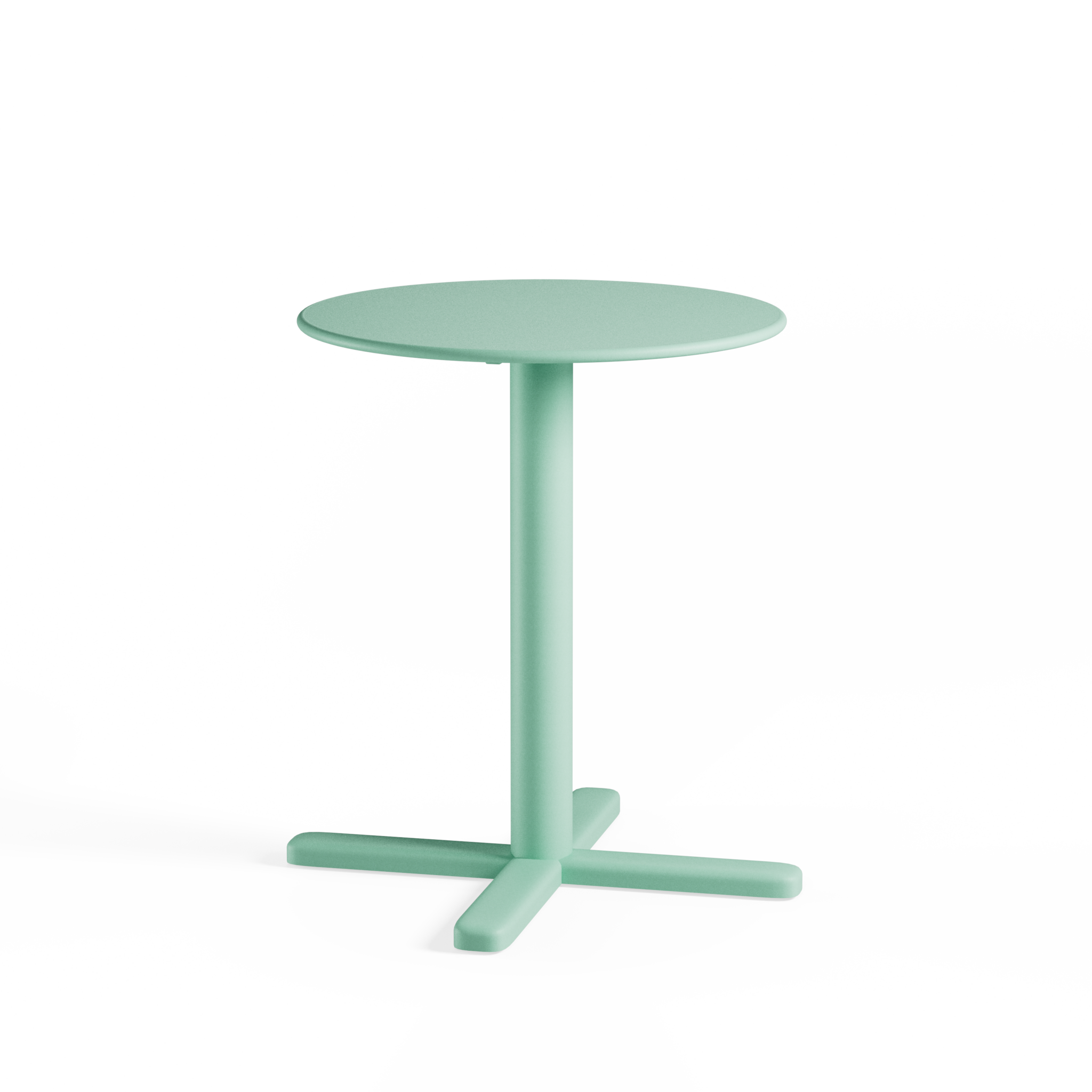 Le plateau rond est fabriqué en acier galvanisé à chaud. Cela signifie : une résistance accrue à la rouille et une surface facile à nettoyer. Le pied en croix offre à la table une base stable, sans te compliquer la vie avec quatre pieds à chaque coin.