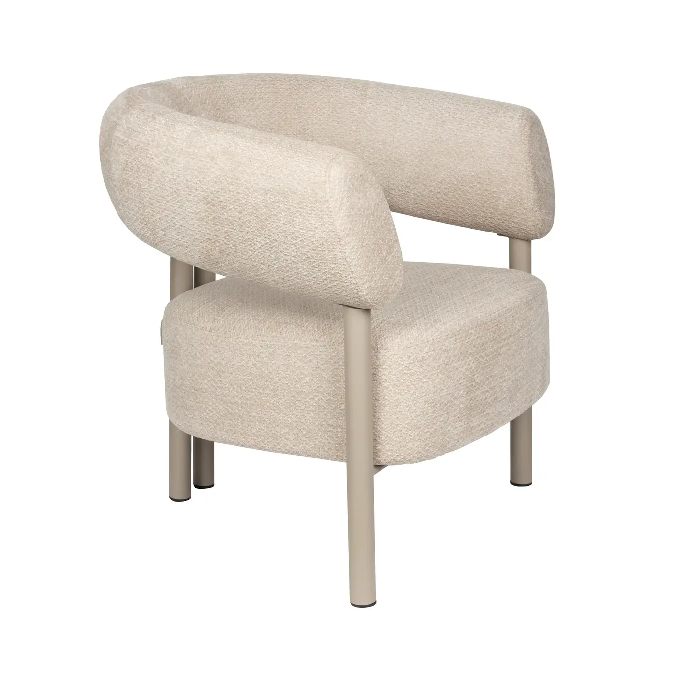 Le revêtement doux et câlin dans un ton beige frais renforce cette atmosphère douillette, tandis que le piètement métallique de la même couleur maintient le design calme et équilibré. Les pieds arrière sont étonnamment proches l'un de l'autre et donnent à la chaise ce détail ludique qui fait la différence. Assez confortable pour de longs dîners, assez stylée pour être vue.