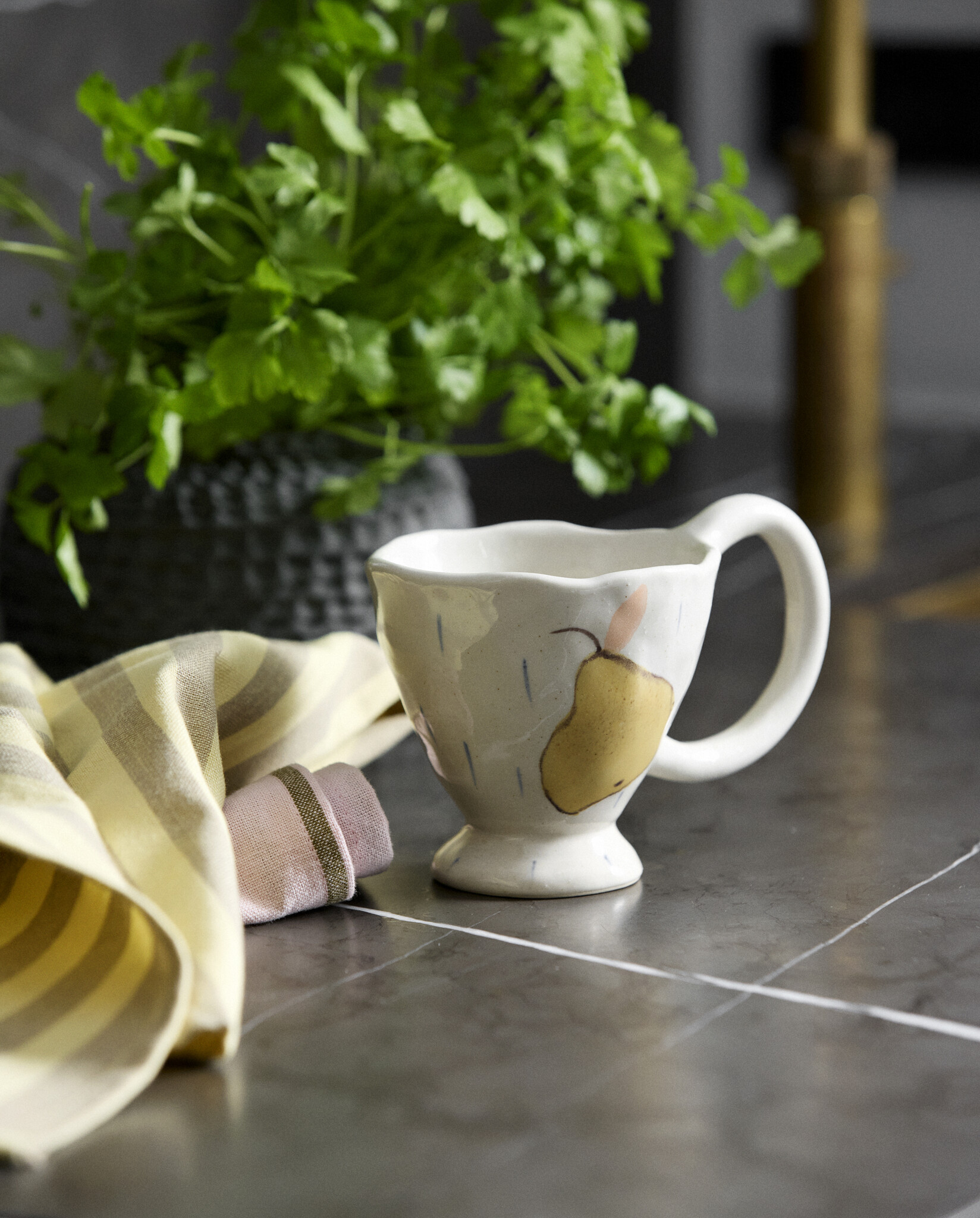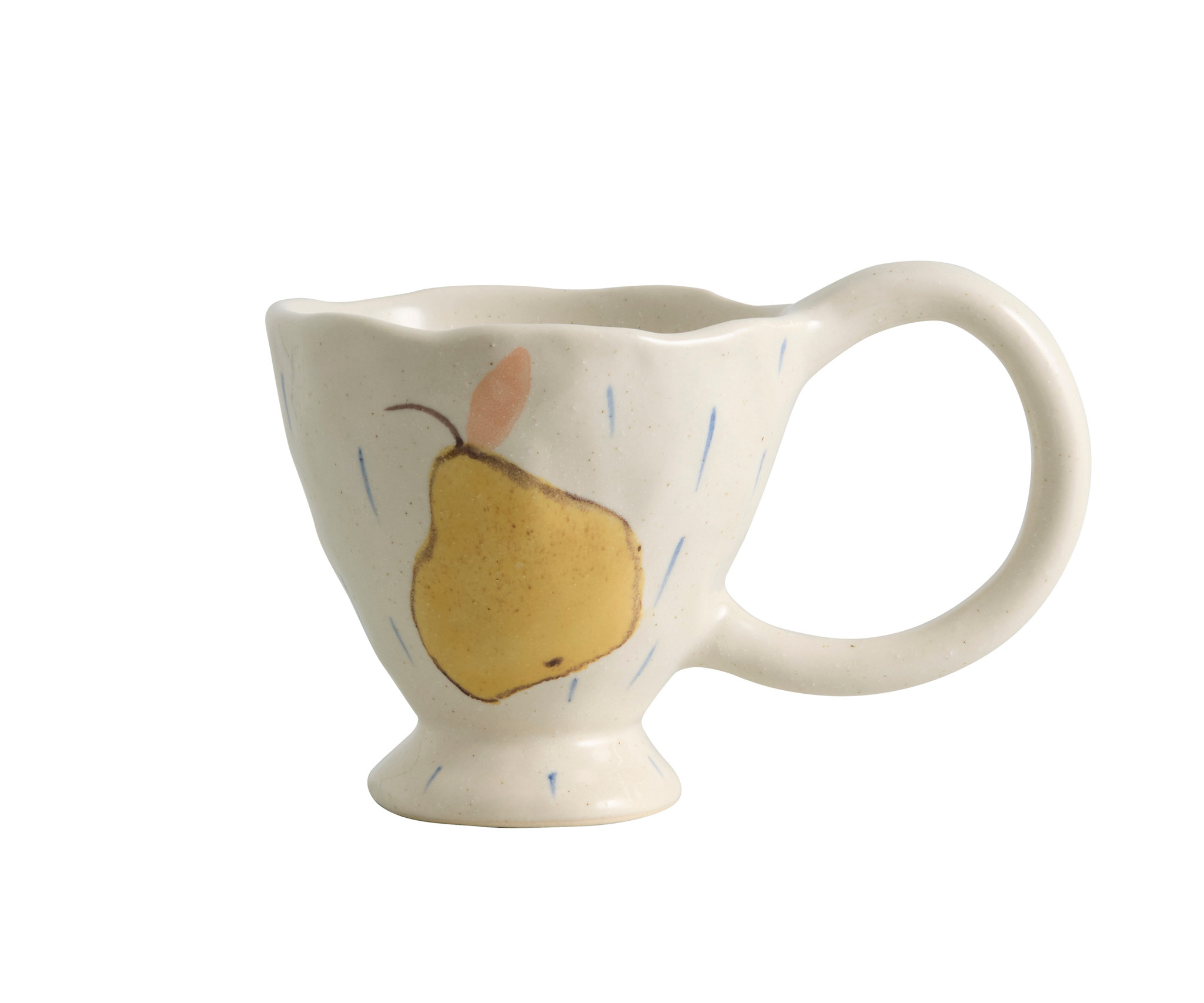 La légère couche de glaçure laisse joliment transparaître le travail artisanal, tandis que le motif poire jaune peint à la main apporte une note ludique. Charmant, sans être enfantin. Idéal pour le café, le thé ou quelque chose de chaud qui mérite un moment.