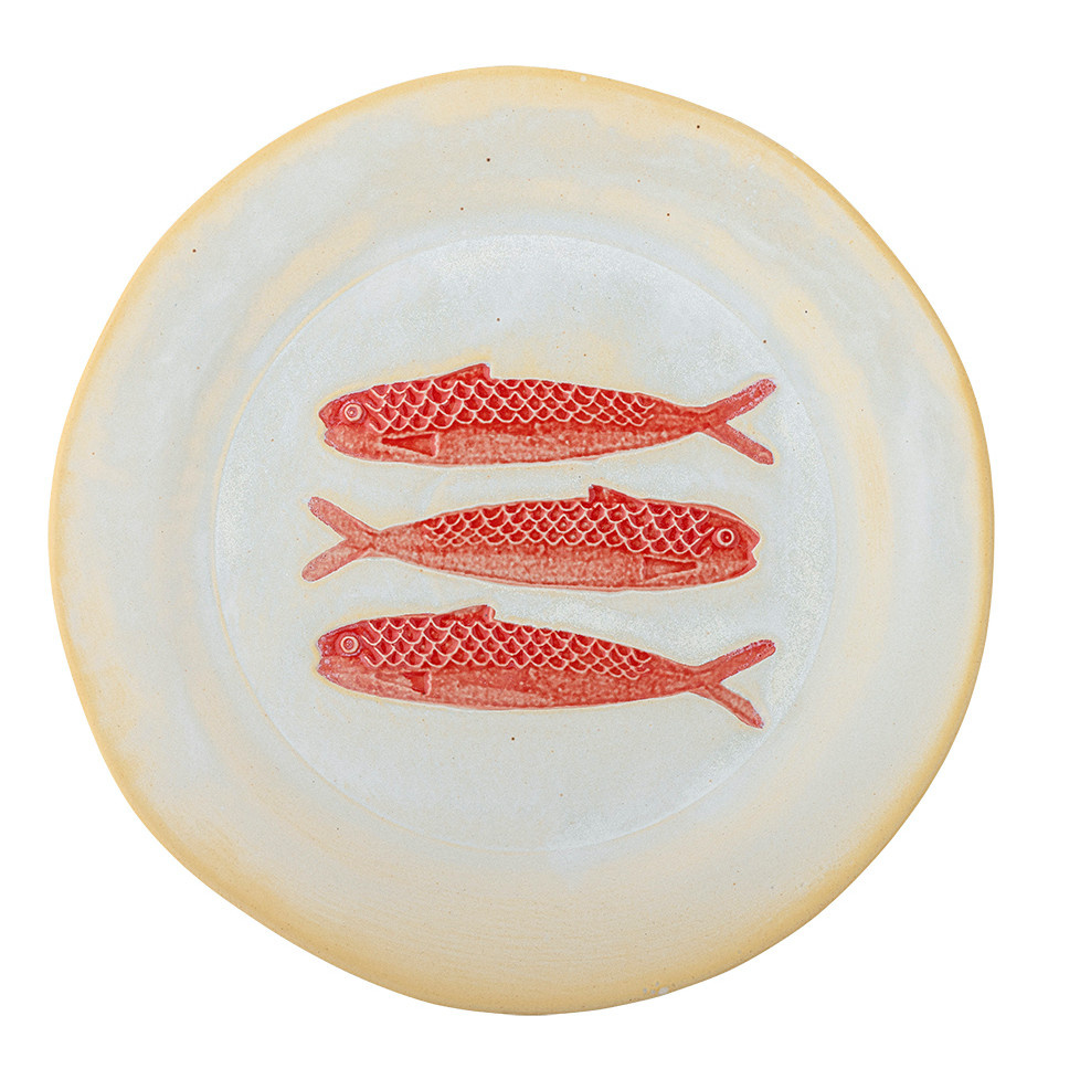 Bloomingville Hadden set van 4 borden van steengoed met reliëfmotief van drie rode vissen en warme gouden rand. Lees meer