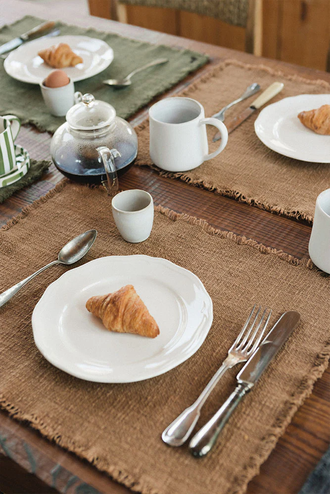 Deze set van twee handgemaakte placemats in een warme okerkleur is geweven volgens de traditionele handloomtechniek. Elk exemplaar is uniek en vervaardigd door vakmensen, met subtiele details zoals handgestikte kruisjes in de vorm van de letter "L" – een teken van authentiek vakwerk. Het tijdloze ontwerp benadrukt de natuurlijke structuur en zachtheid van katoen, perfect voor zowel dagelijks gebruik als bijzondere gelegenheden.