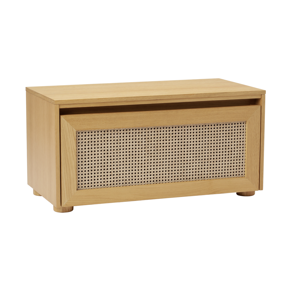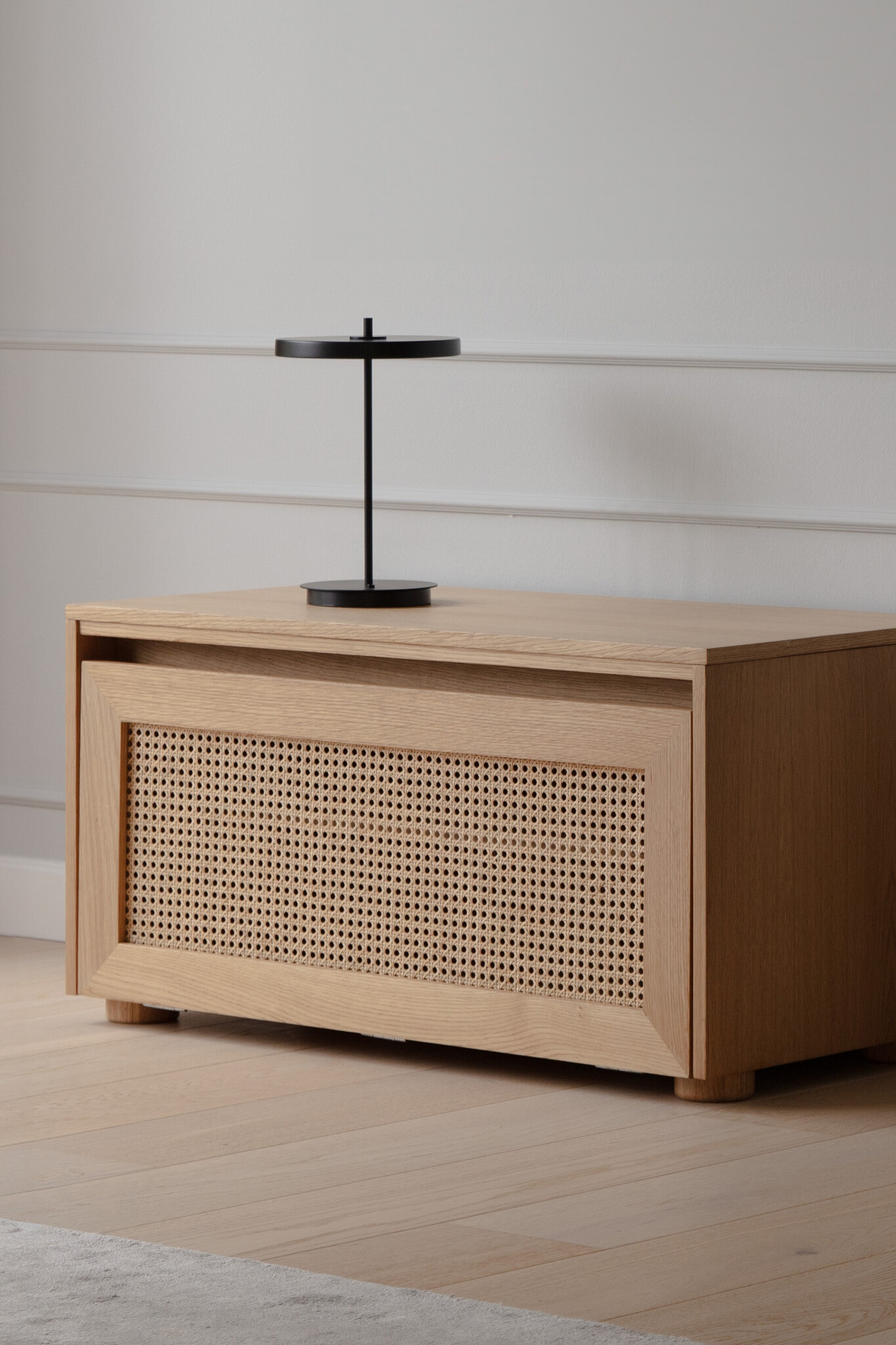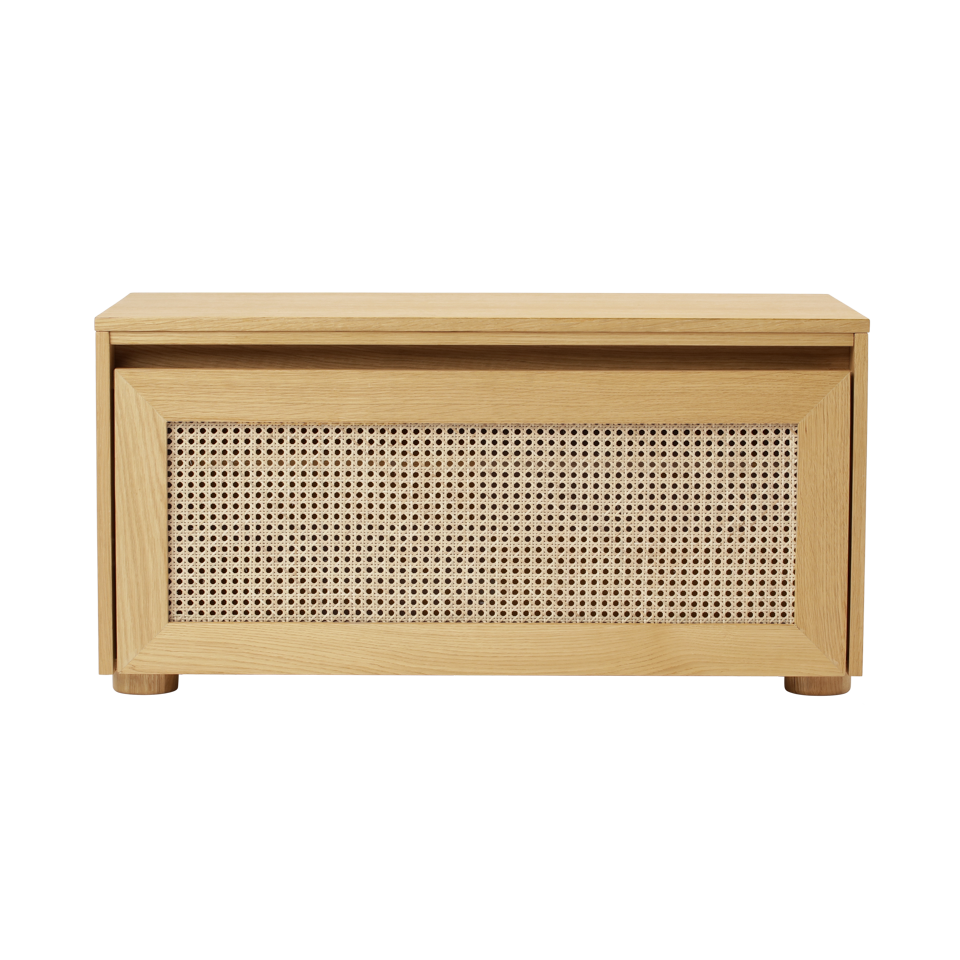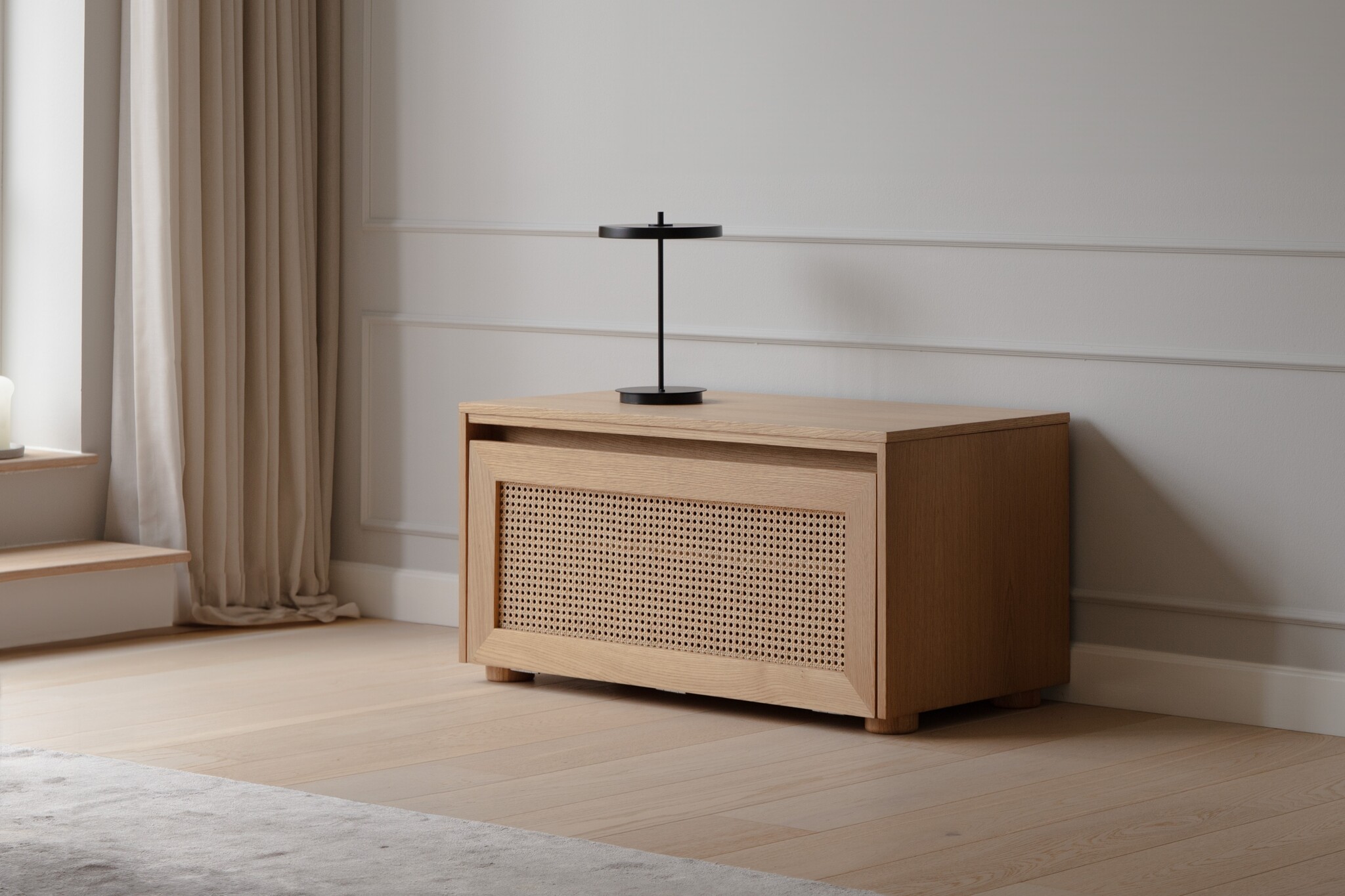 Gemaakt uit eikenfineer en afgewerkt met een karakteristieke cannage deur, is Hideaway even praktisch als elegant. Het meubel doet moeiteloos dienst in verschillende ruimtes: als schoenenbank in de hal, lage kast in de woonkamer of knusse leesplek in de kinderkamer. Dankzij de optionele plank en kussen breid je de functionaliteit eenvoudig uit – voor wie houdt van opgeruimd wonen met oog voor detail.