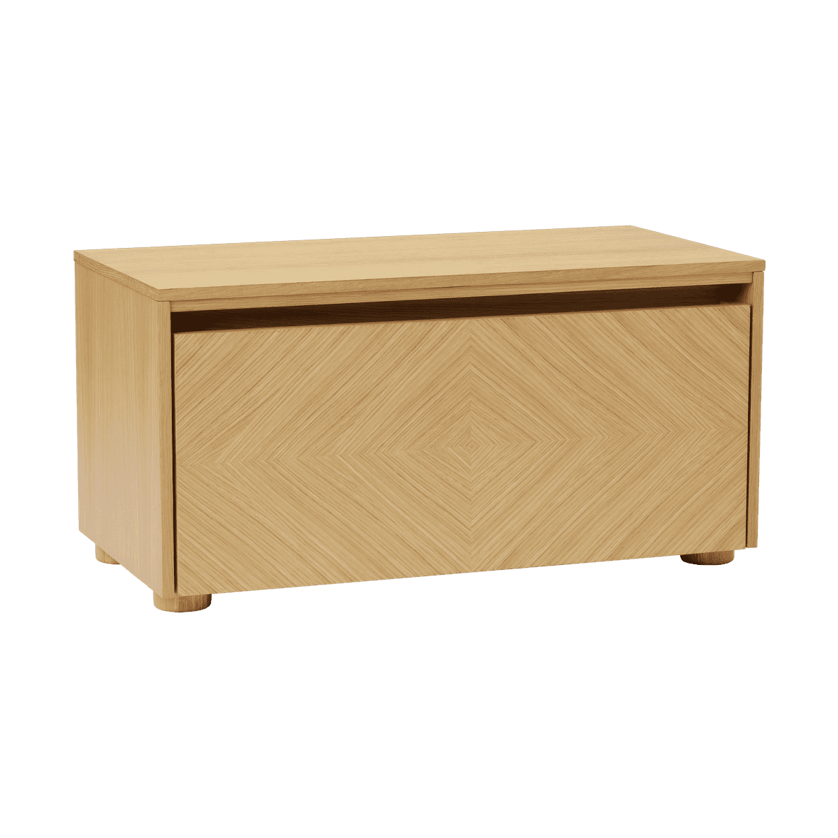 Gemaakt uit eikenfineer en afgewerkt met een karakteristieke patroondeur, is deze Hideaway even praktisch als elegant. Het meubel doet moeiteloos dienst in verschillende ruimtes: als schoenenbank in de hal, lage kast of tv-meubel in de woonkamer of knusse leesplek in de kinderkamer. Dankzij de optionele plank en kussen breid je de functionaliteit eenvoudig uit – voor wie houdt van opgeruimd wonen met oog voor detail.
