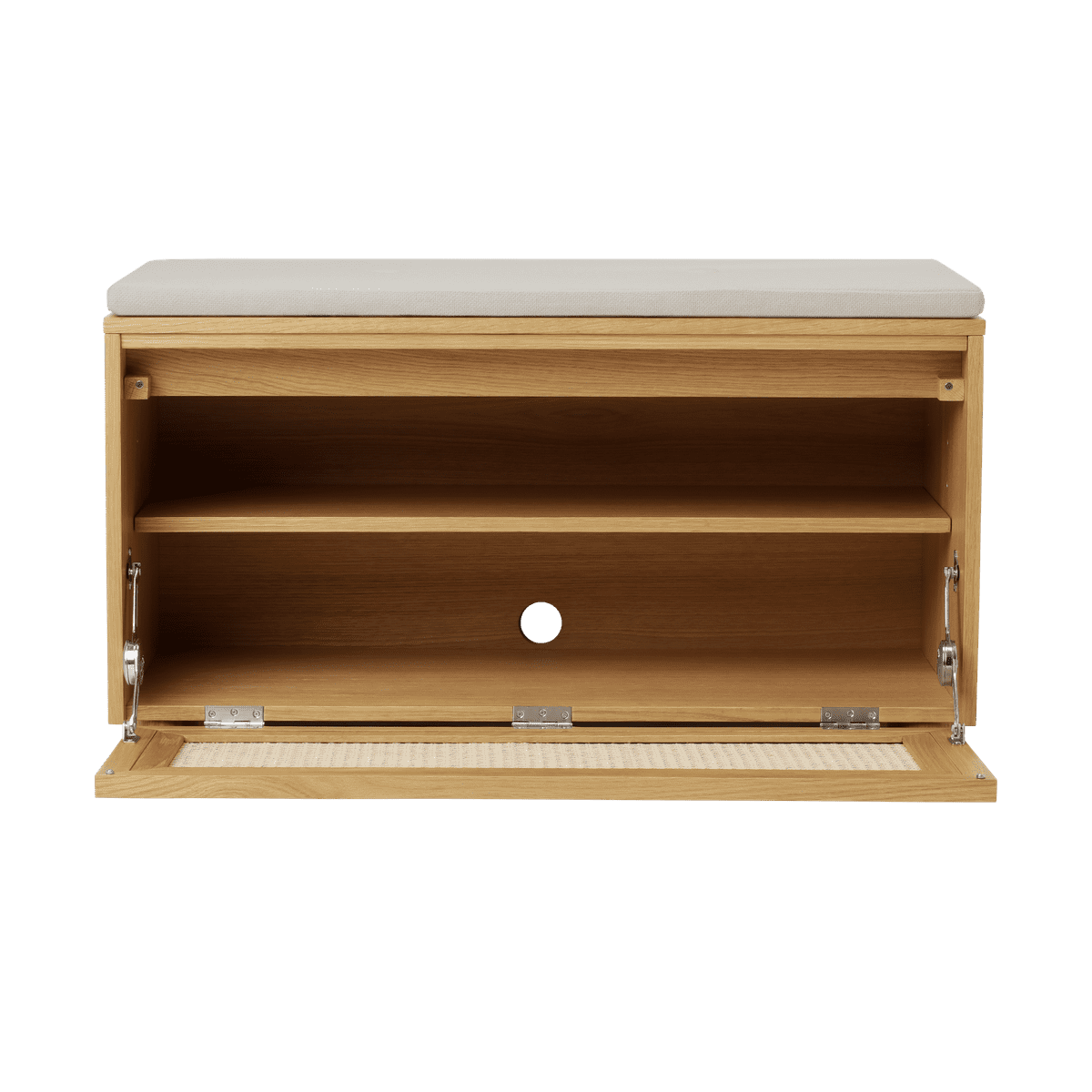 Dankzij het slimme ontwerp is Hideaway inzetbaar in verschillende ruimtes: in de hal als zitbank met opbergruimte voor schoenen, in de kinderkamer als gezellige leesplek of in de woonkamer als stijlvol tv-meubel dat snoeren en apparatuur discreet wegwerkt.