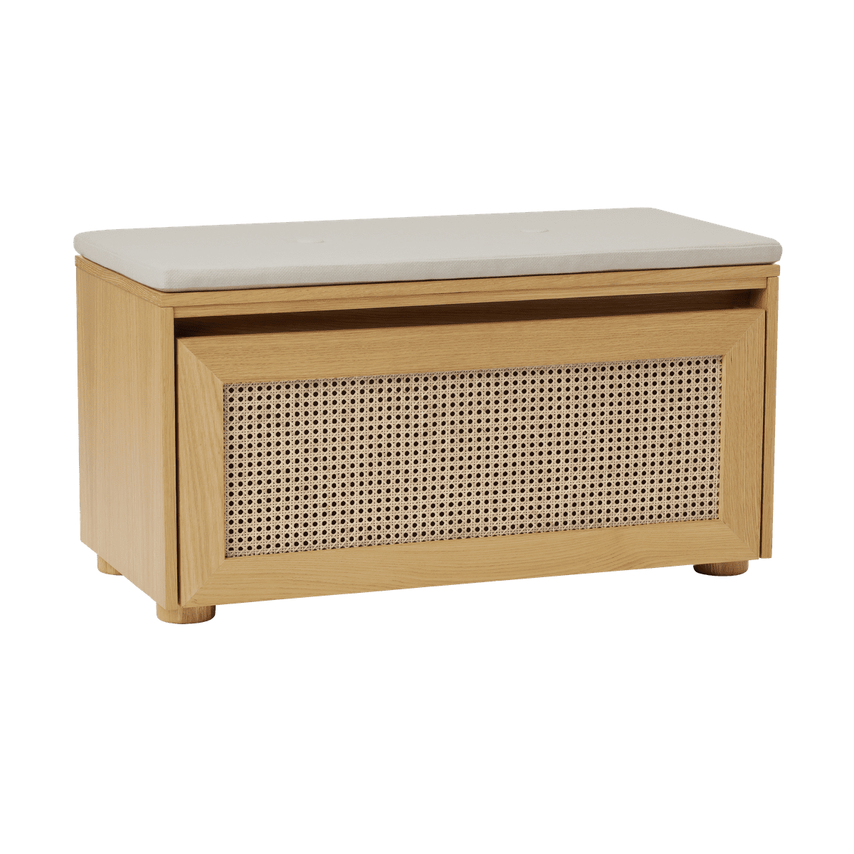 De Hideaway opbergbank van Umage is ontworpen om op een natuurlijke manier orde en rust te brengen in je interieur. Vervaardigd uit eikfineer met een verfijnde houtstructuur, door de webben structuur in de klapdeur straalt dit meubel Scandinavische klasse uit — subtiel en functioneel tegelijk.