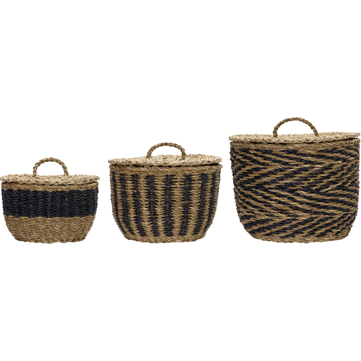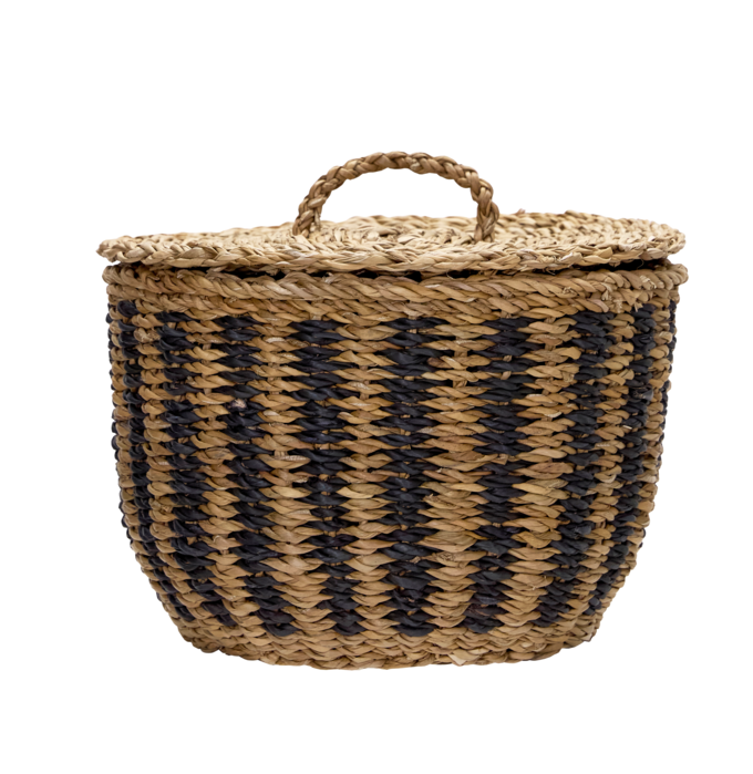 House Doctor Cesto opbergmand medium – handgemaakte zeegras mand met deksel en zwart patroon. Los verkrijgbaar of combineer met andere maten voor een stijlvolle set. Lees meer