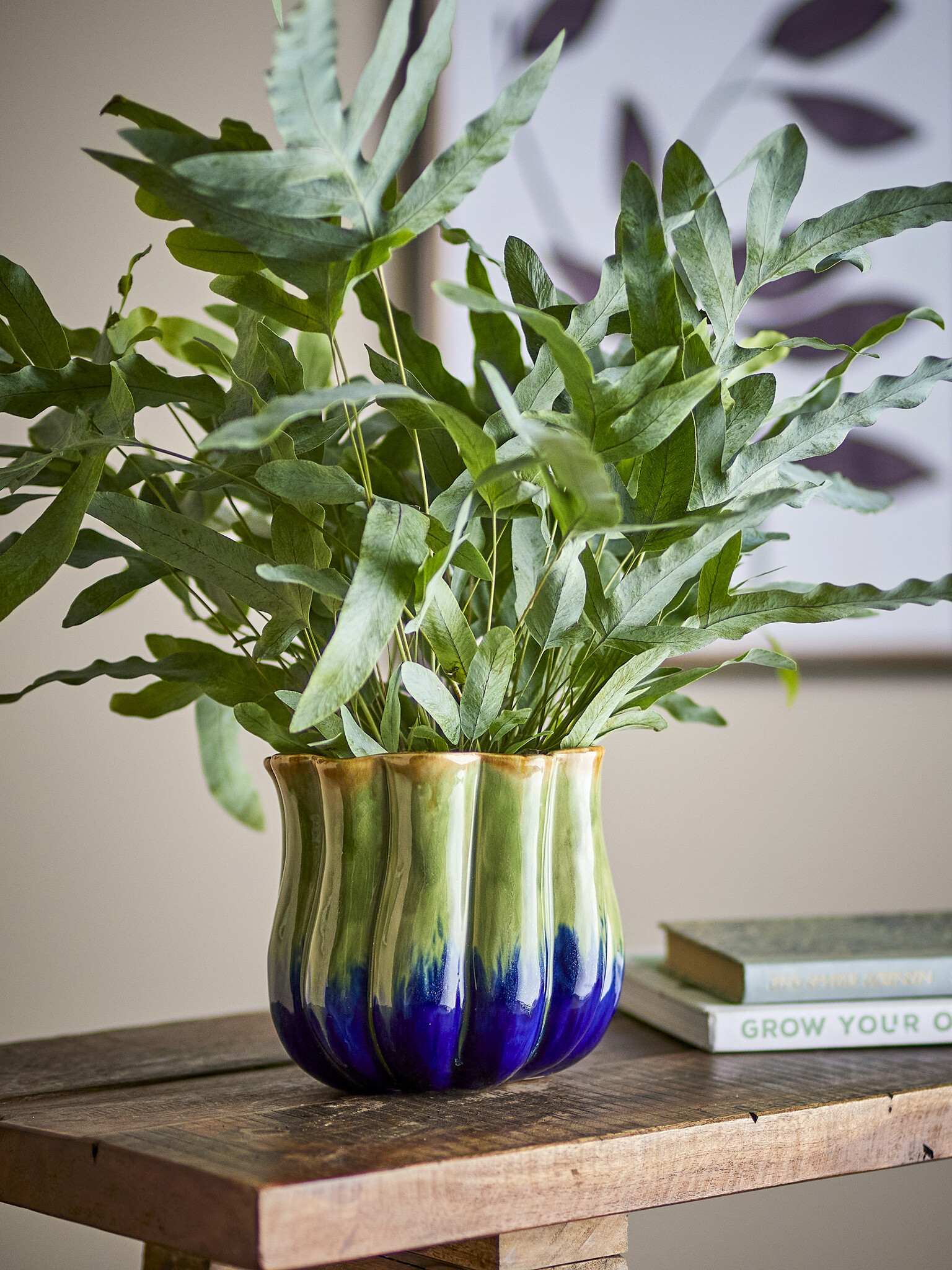 De Jenner flowerpot is gemaakt van keramiek en afgewerkt met een reactieve glazuur, wat zorgt voor een levendig oppervlak en zachte overgangen in kleur en textuur. De verticale groeven geven de pot extra diepte, terwijl de afgeronde vorm haar een rustige uitstraling geeft.