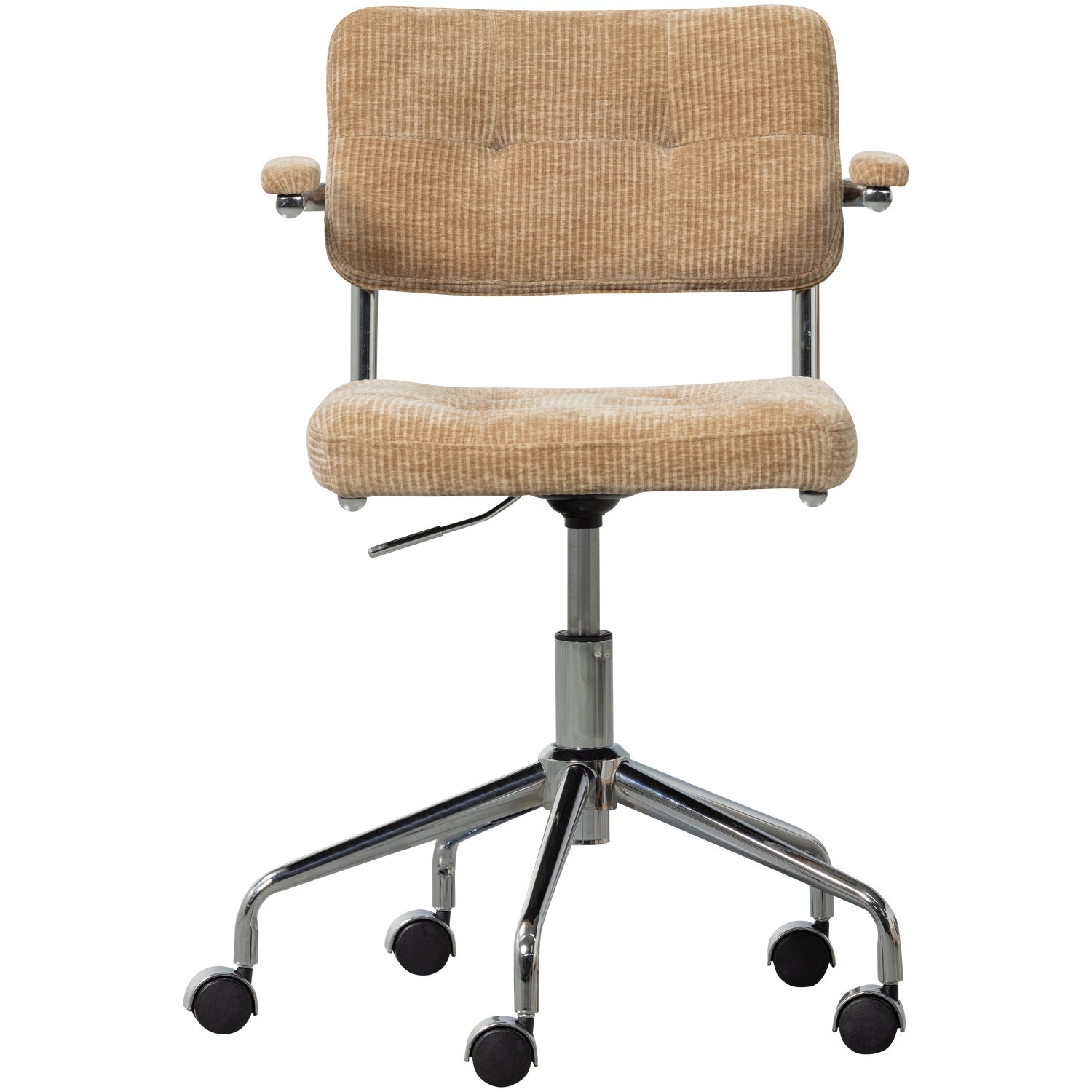 Met de Kova bureaustoel van WOOOD zit je goed, letterlijk en figuurlijk. Deze stijlvolle thuiswerkbuddy combineert comfort met karakter, dankzij de rijke ribstof in een warme donkerzandkleur. Zowel de zitting, rugleuning als armleuningen zijn volledig gestoffeerd voor maximaal comfort – of je nu blokt voor een examen of focust op je deadline.
