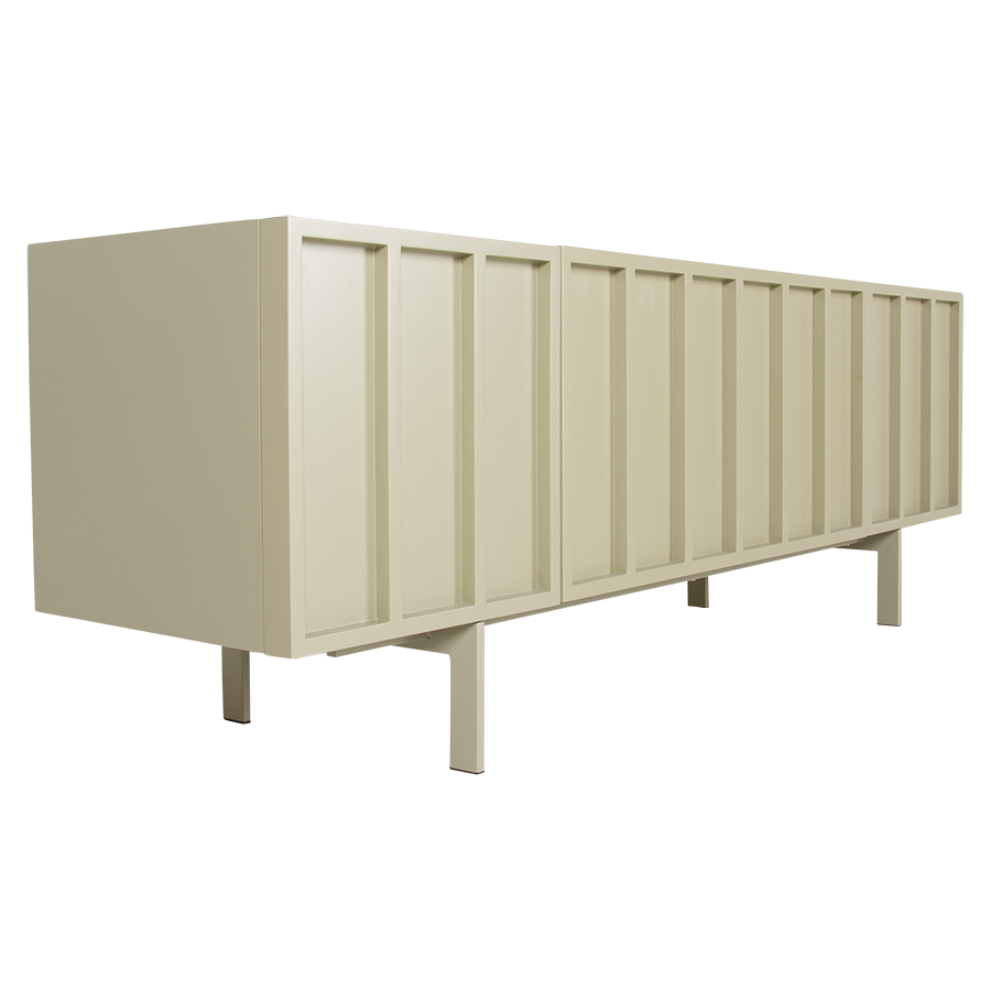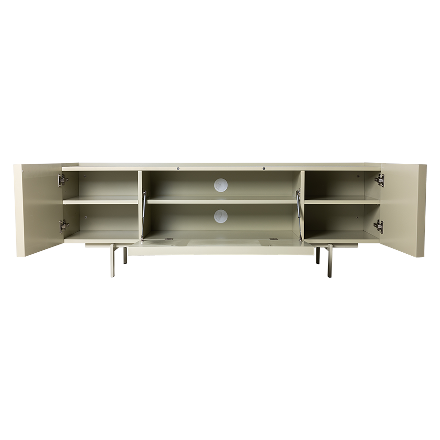 Deze lage kast combineert een sobere vormtaal met praktisch gebruiksgemak. De stevige deuren zijn voorzien van een soft-close systeem, terwijl het middelste vak naar beneden opent voor vlotte toegang tot elektronica of opbergruimte. Kabeldoorvoeren aan de achterzijde en binnenin zorgen ervoor dat alles netjes uit het zicht blijft.