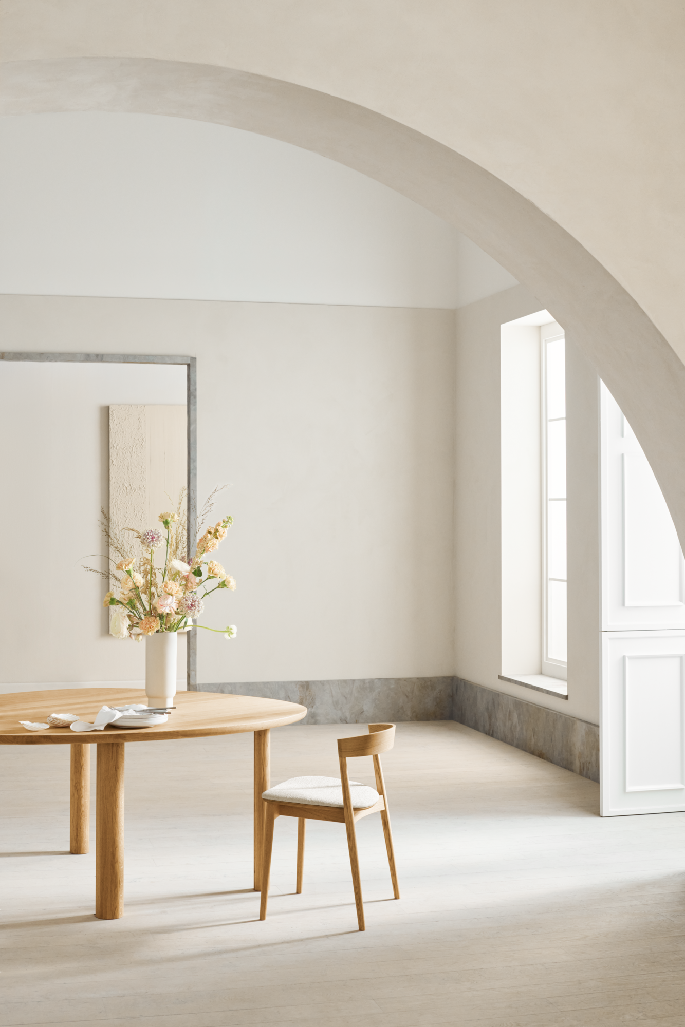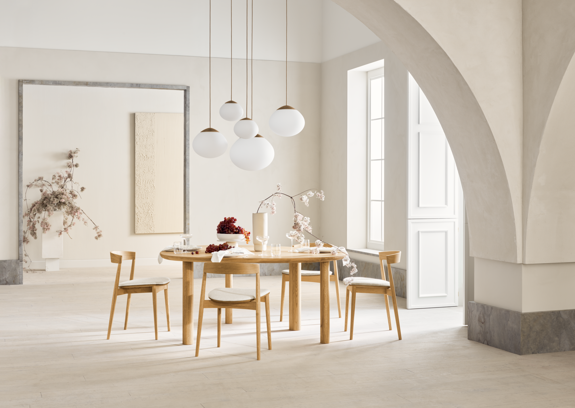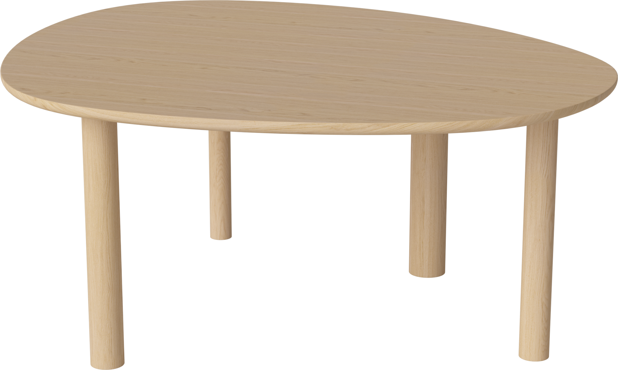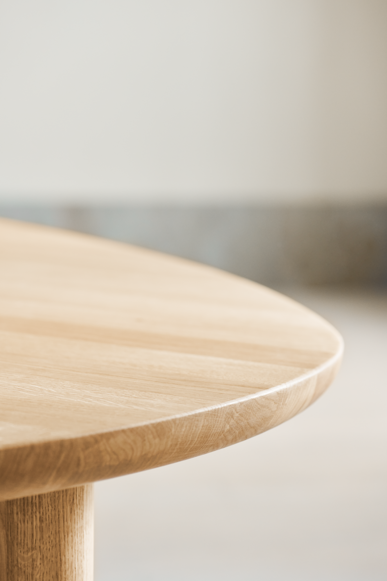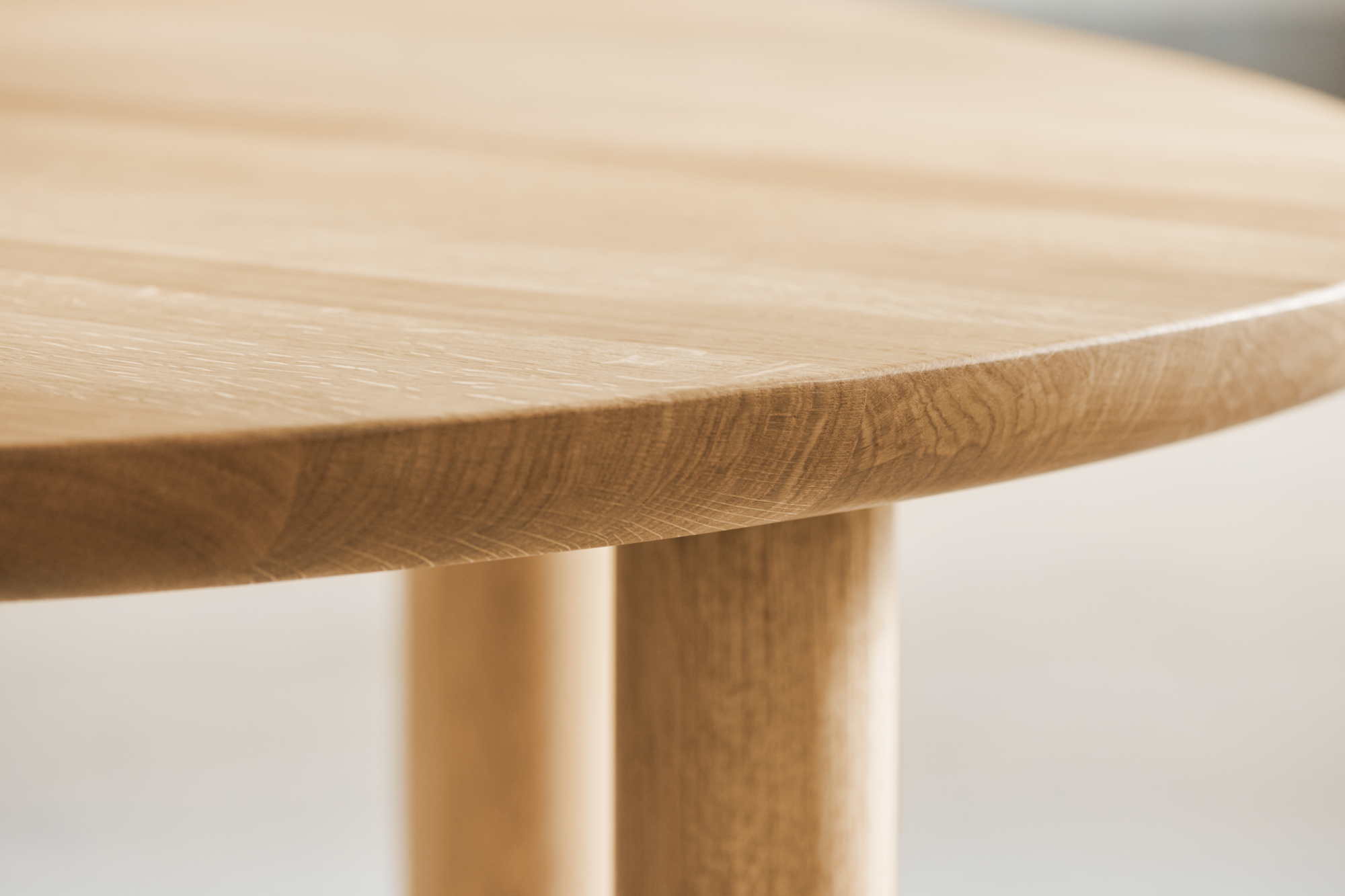 Een zwaar tafelblad van FSC®-gecertificeerd eiken en grove eikenhouten poten met een speels variërende diameter – dankzij de asymmetrische plaatsing is er voldoende ruimte voor maximaal 6 stoelen.