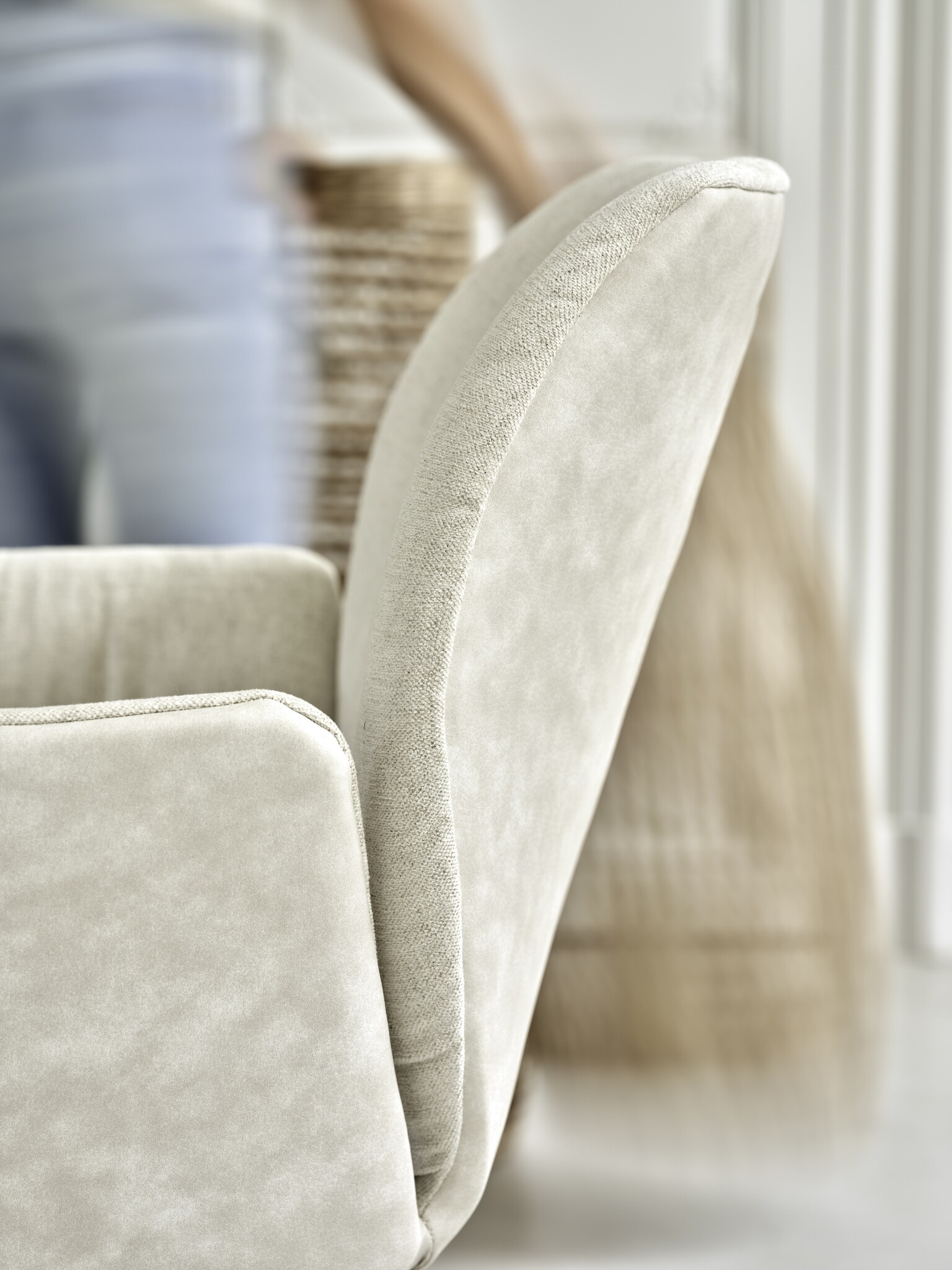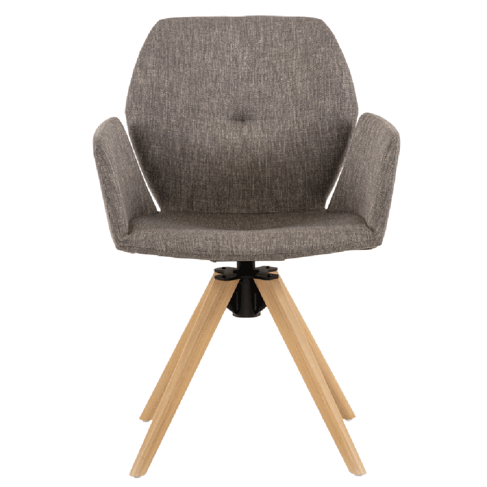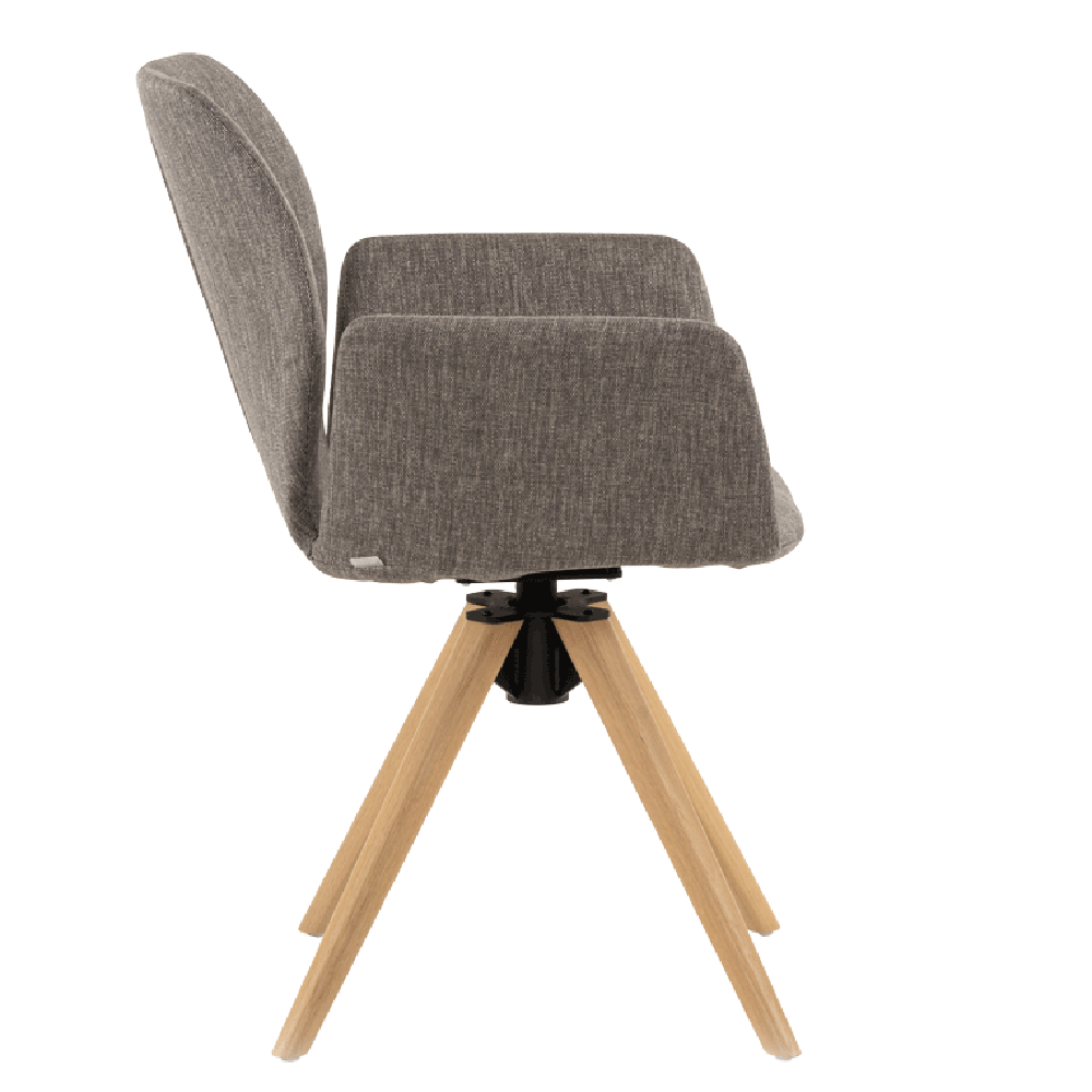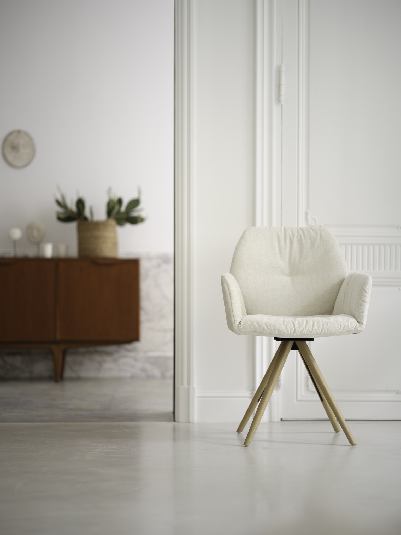 Deze stoel combineert comfort met functionaliteit. De subtiele armleuningen en zachte zitting maken de stoel ideaal voor lange diners of vergaderingen, terwijl de houten draaivoet met retoursysteem zorgt voor een praktische meerwaarde.