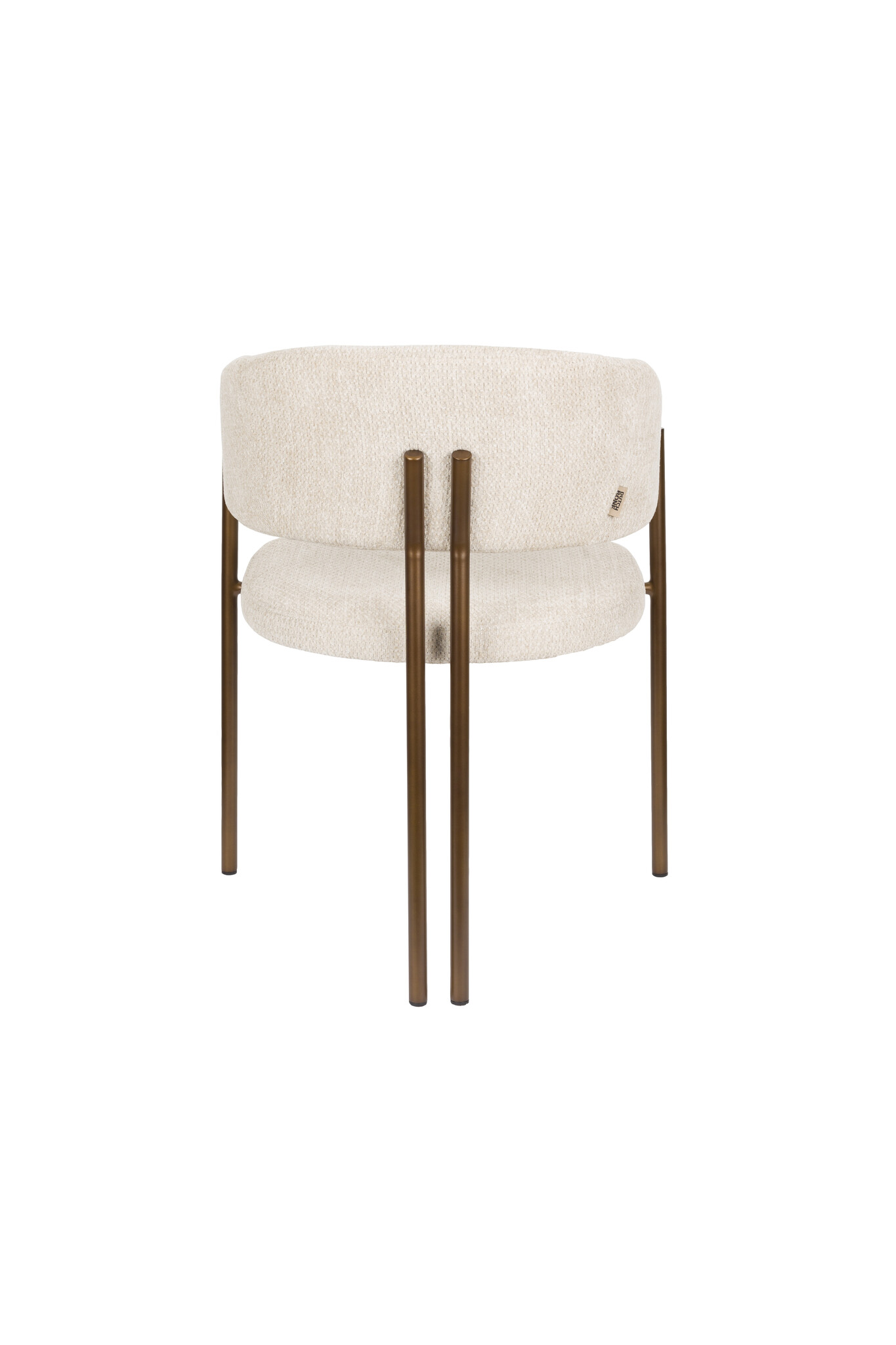 De zitting en rugleuning zijn rijk bekleed met bouclé stof in een warme beigetint. Dat geeft niet alleen textuur, maar ook dat uitnodigende gevoel waardoor je net iets langer blijft zitten. Handig als het gesprek ineens interessanter wordt dan het dessert.