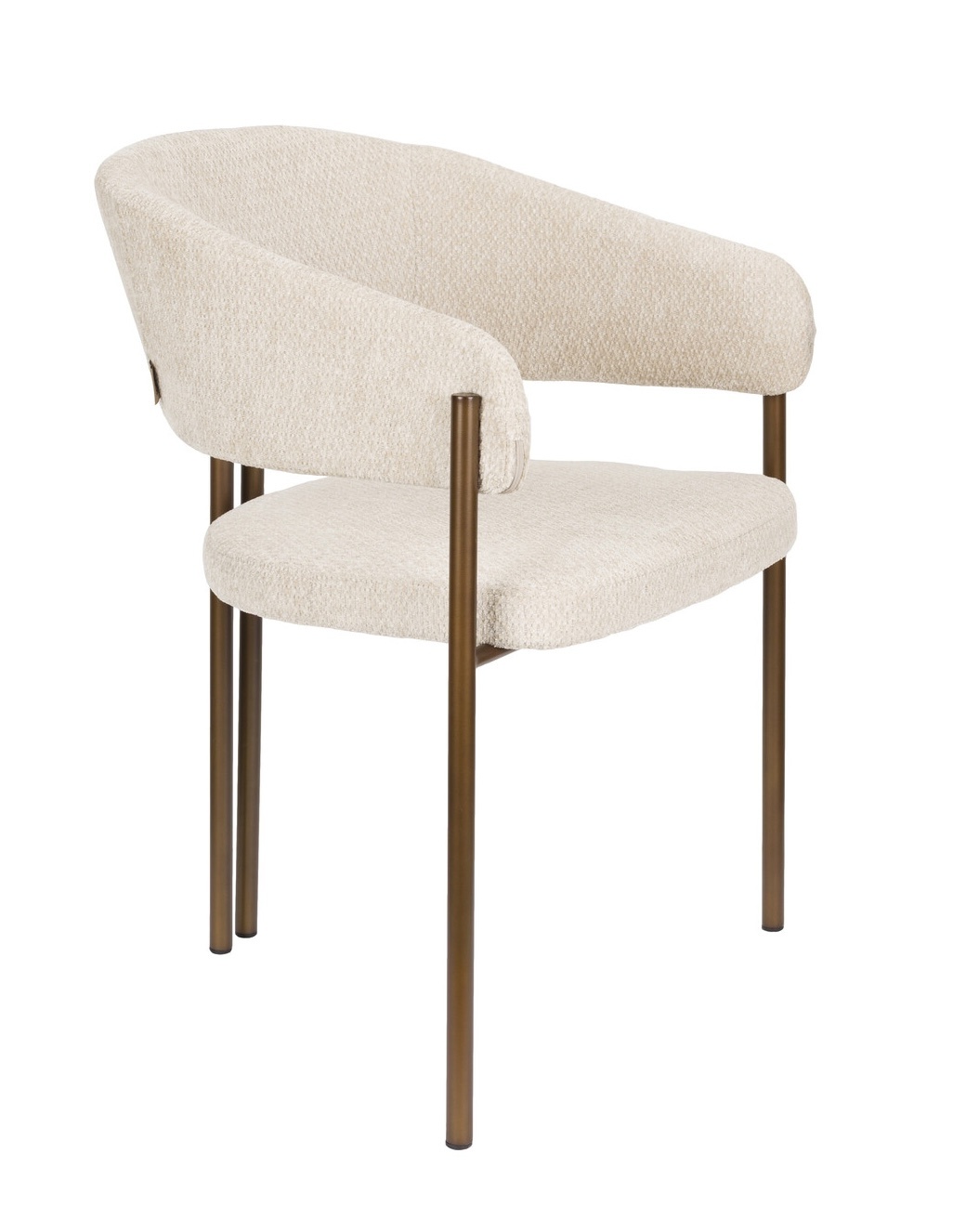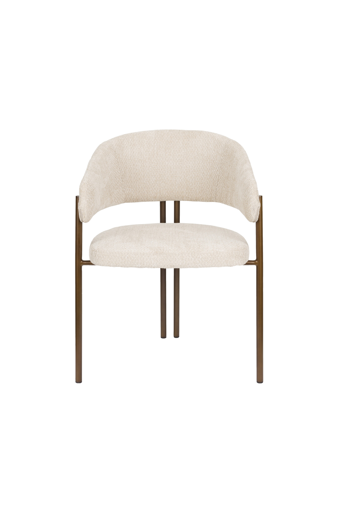 Het slanke frame van staal met bronzen afwerking houdt het geheel luchtig en voegt tegelijk warmte toe. De kuipvorm met armleuningen omsluit subtiel, zonder zwaar te ogen: precies die balans die een eethoek meteen meer sfeer geeft.