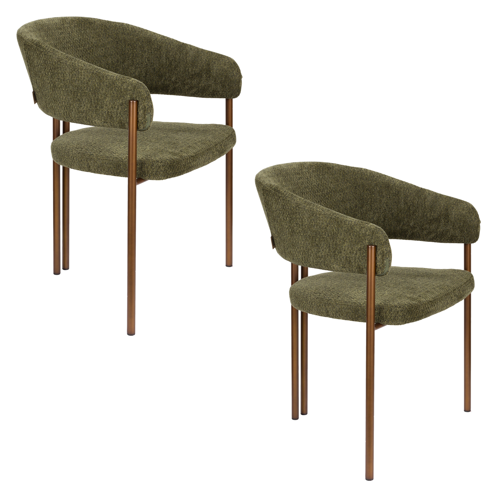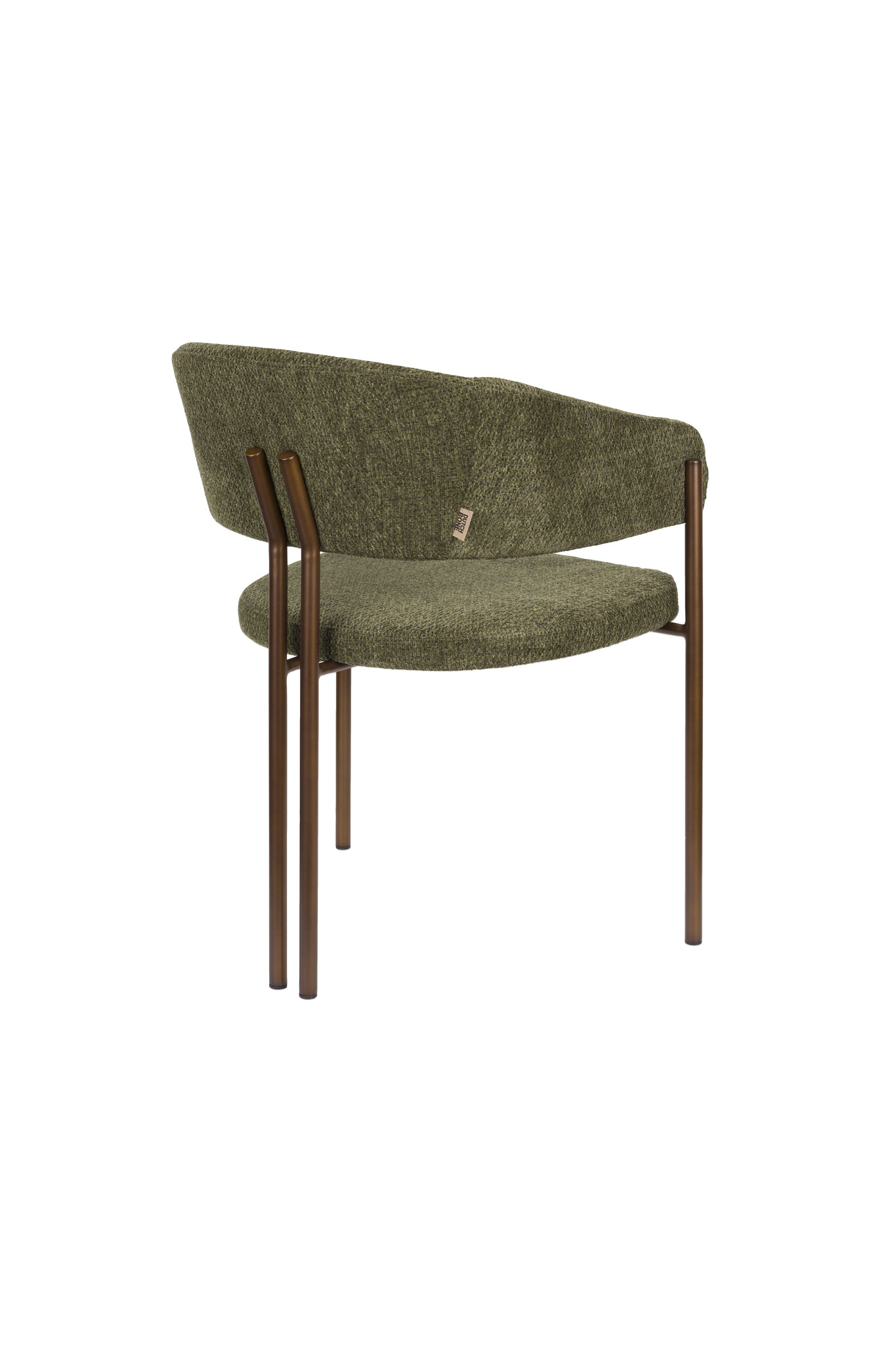 De zitting en rugleuning zijn royaal bekleed met bouclé in een diepe groentint. Die zachte, lusachtige stof geeft meteen karakter, zonder druk te worden in je interieur. De kuipvorm met armleuningen zorgt voor steun en comfort, ideaal als het etentje ongemerkt overgaat in natafelen.