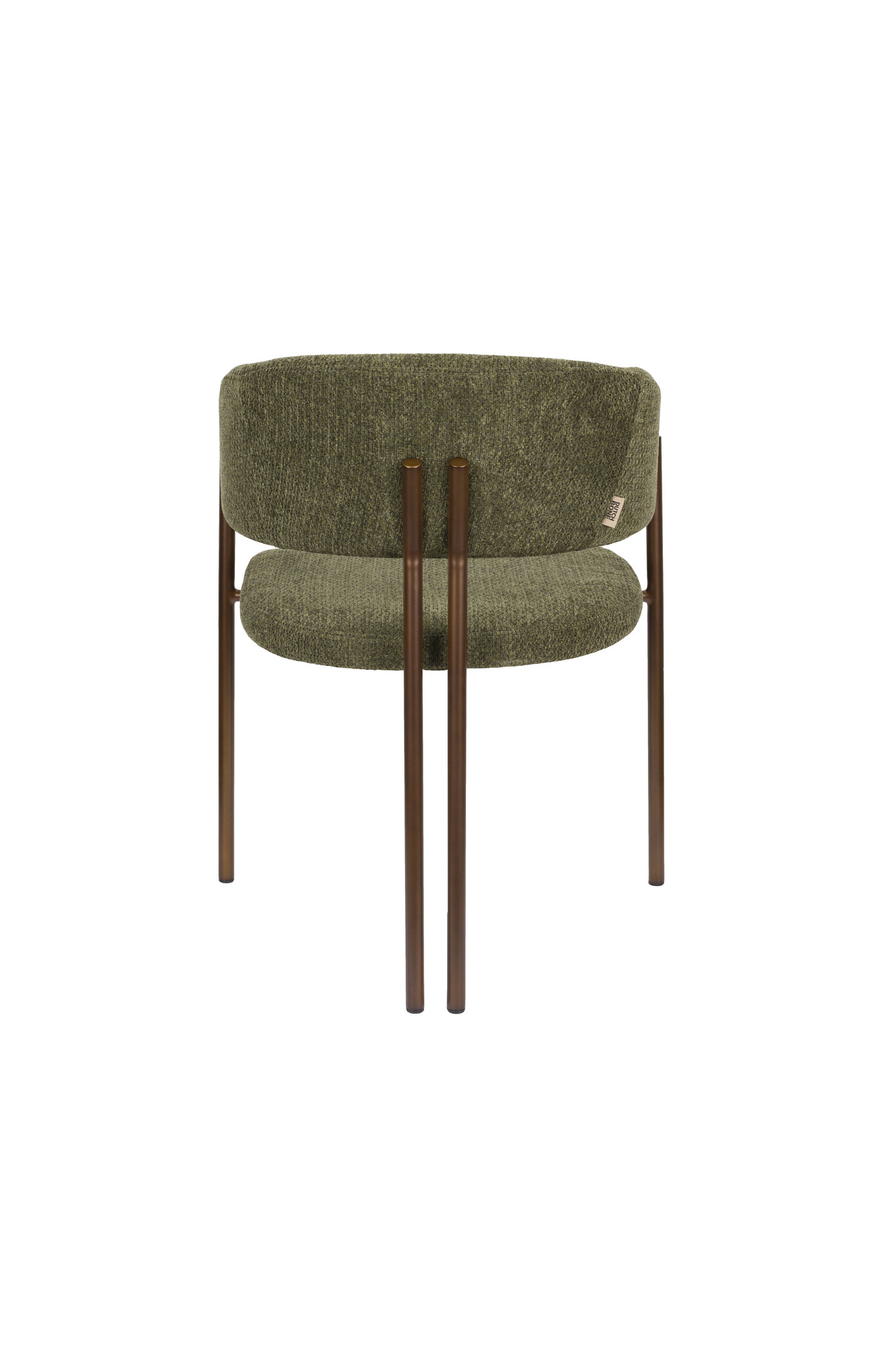Onder de bekleding staat een slank stalen frame met bronzen afwerking. Dat geeft de stoel een verfijnde, bijna grafische basis: warm van kleur, maar visueel licht. Zo past Naida net zo makkelijk bij een houten eettafel als bij een strakker, modern blad.