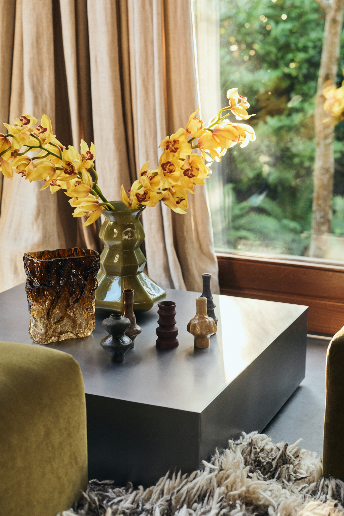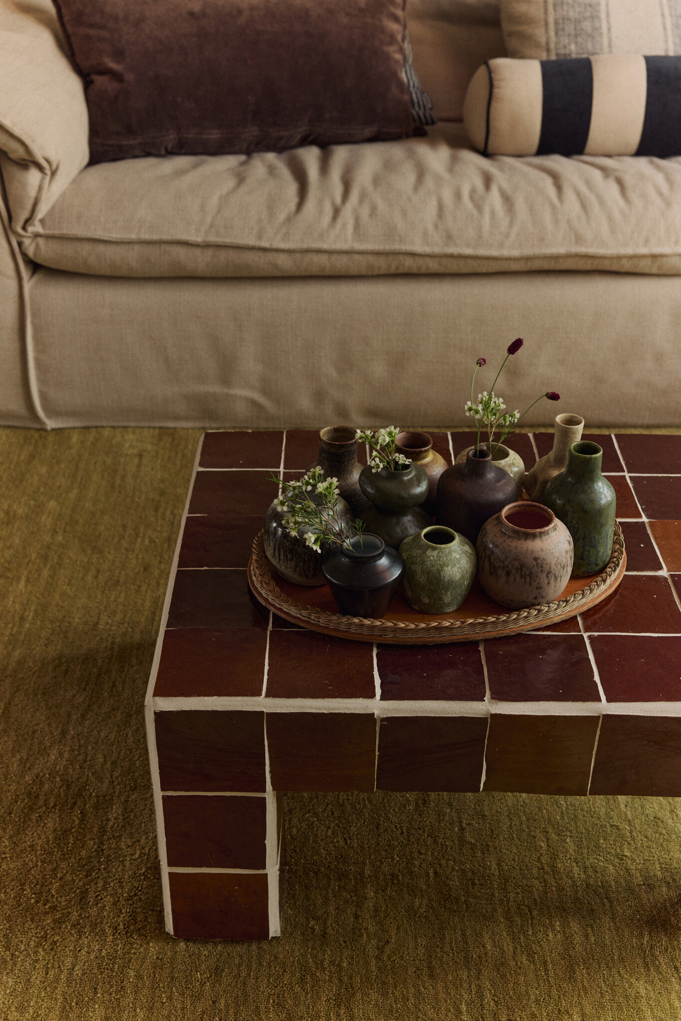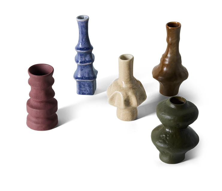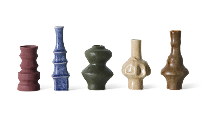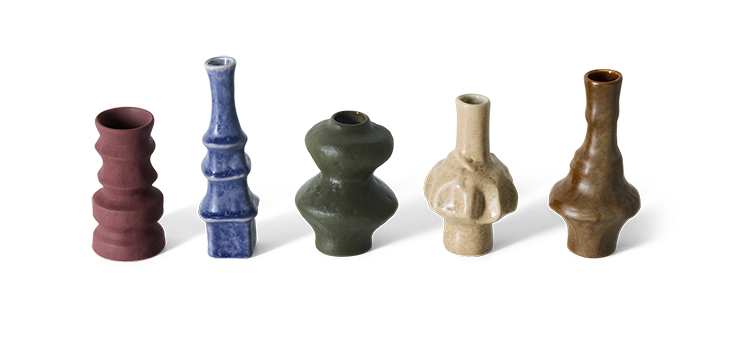 Elk vaasje heeft zijn eigen silhouet en glazuur, waardoor geen enkel stuk identiek is. Samen vormen ze een harmonieus geheel, met een duidelijke knipoog naar de organische vormen en warme uitstraling van keramiek uit de jaren ’70.