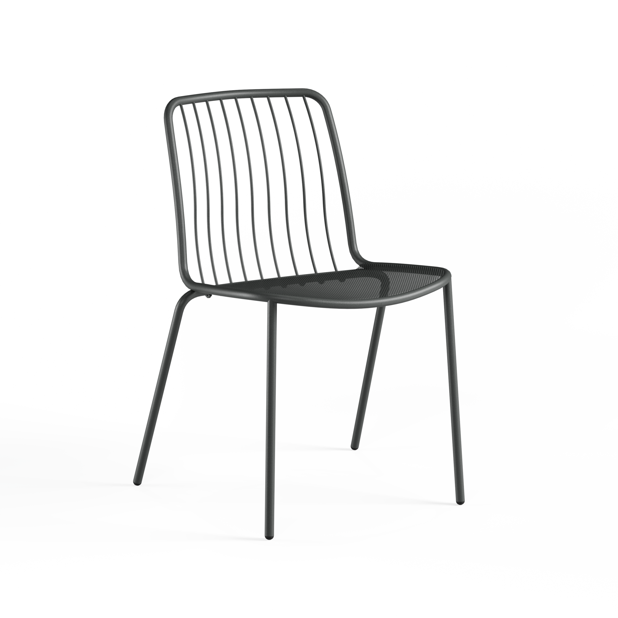 De zitting in stalen mesh zit aangenaam en ventileert vanzelf op warme dagen. De rugleuning is opgebouwd uit slanke metalen spijlen, wat de stoel een open, dynamische look geeft die mooi past bij moderne en contemporary terrassen, maar evengoed bij een meer industrieel buitenconcept.