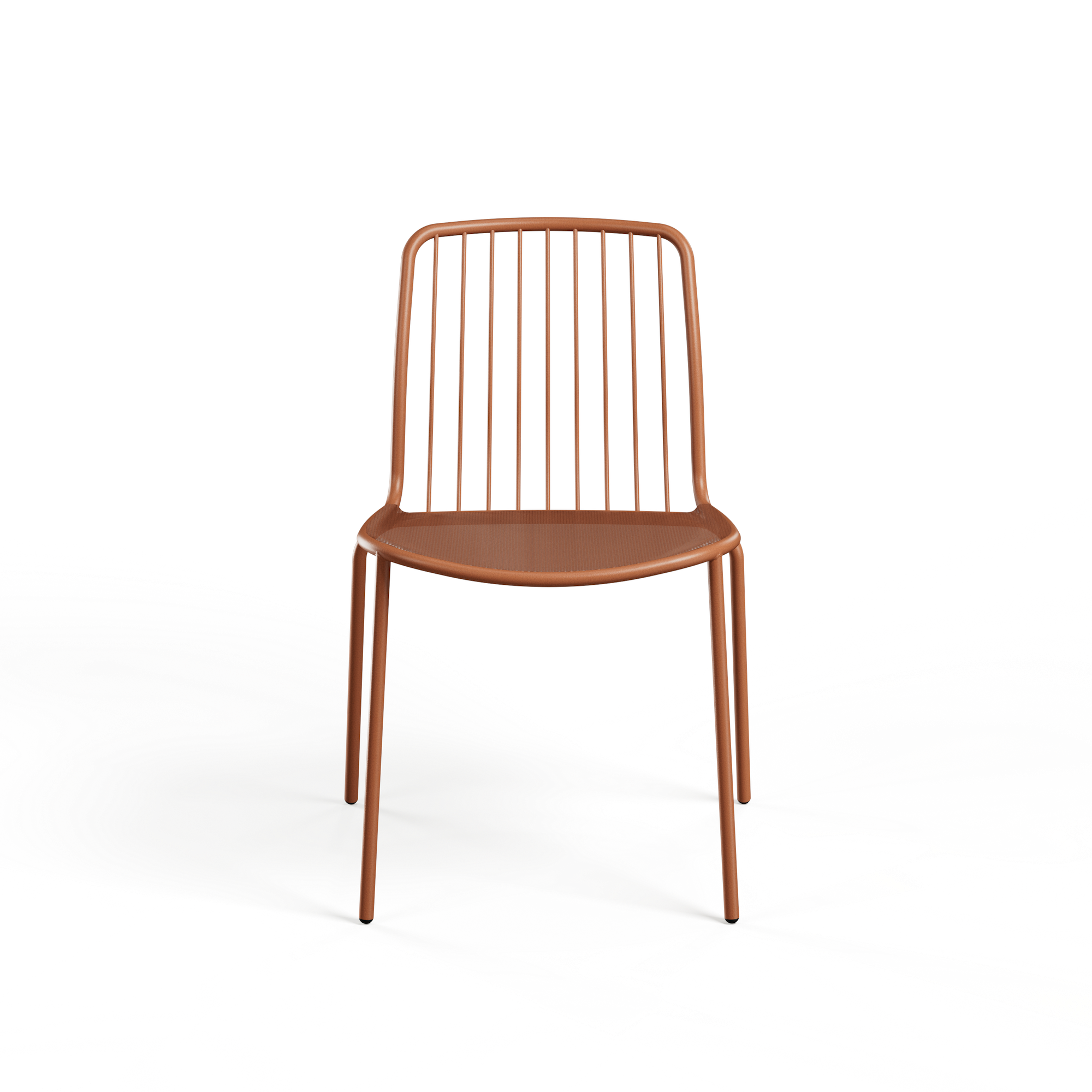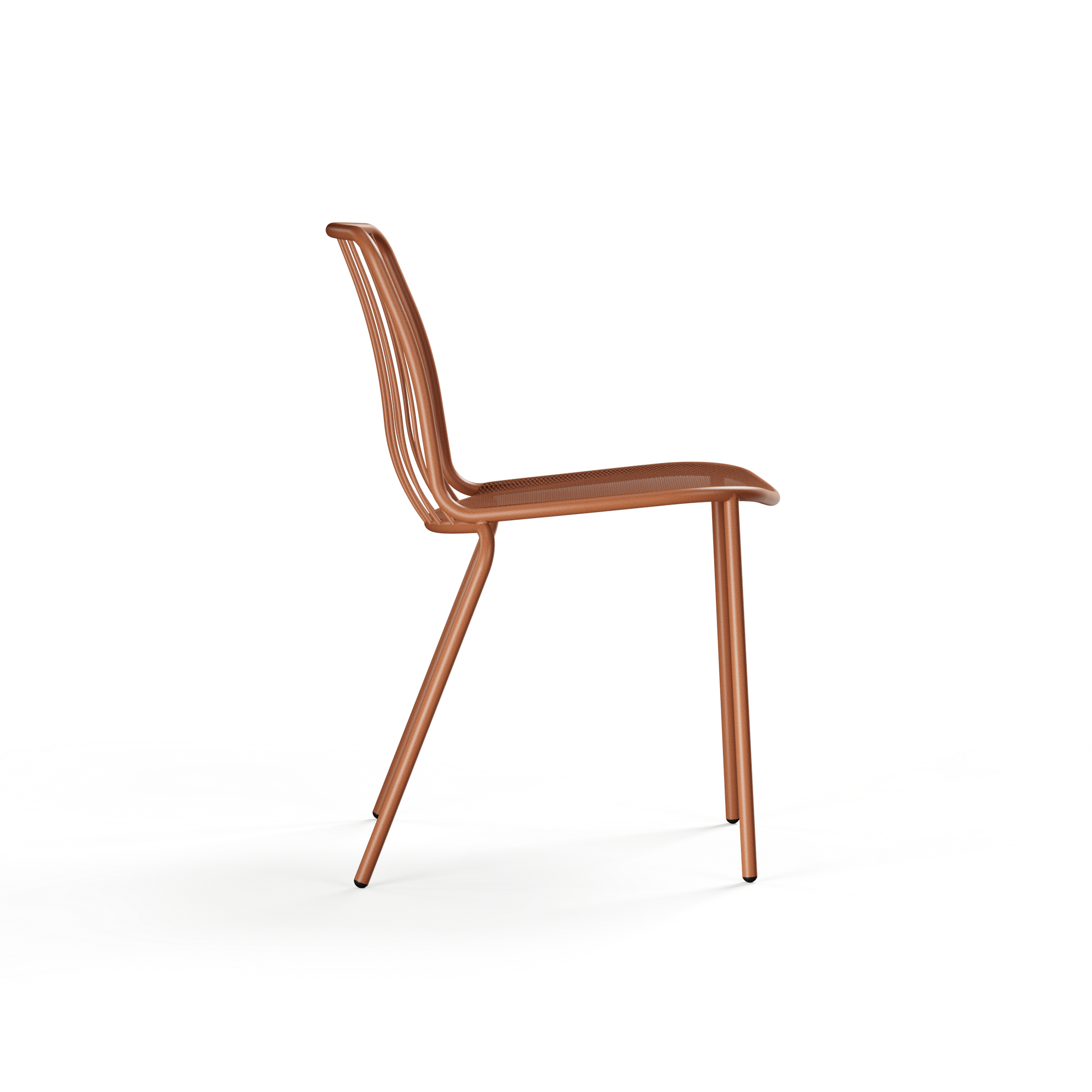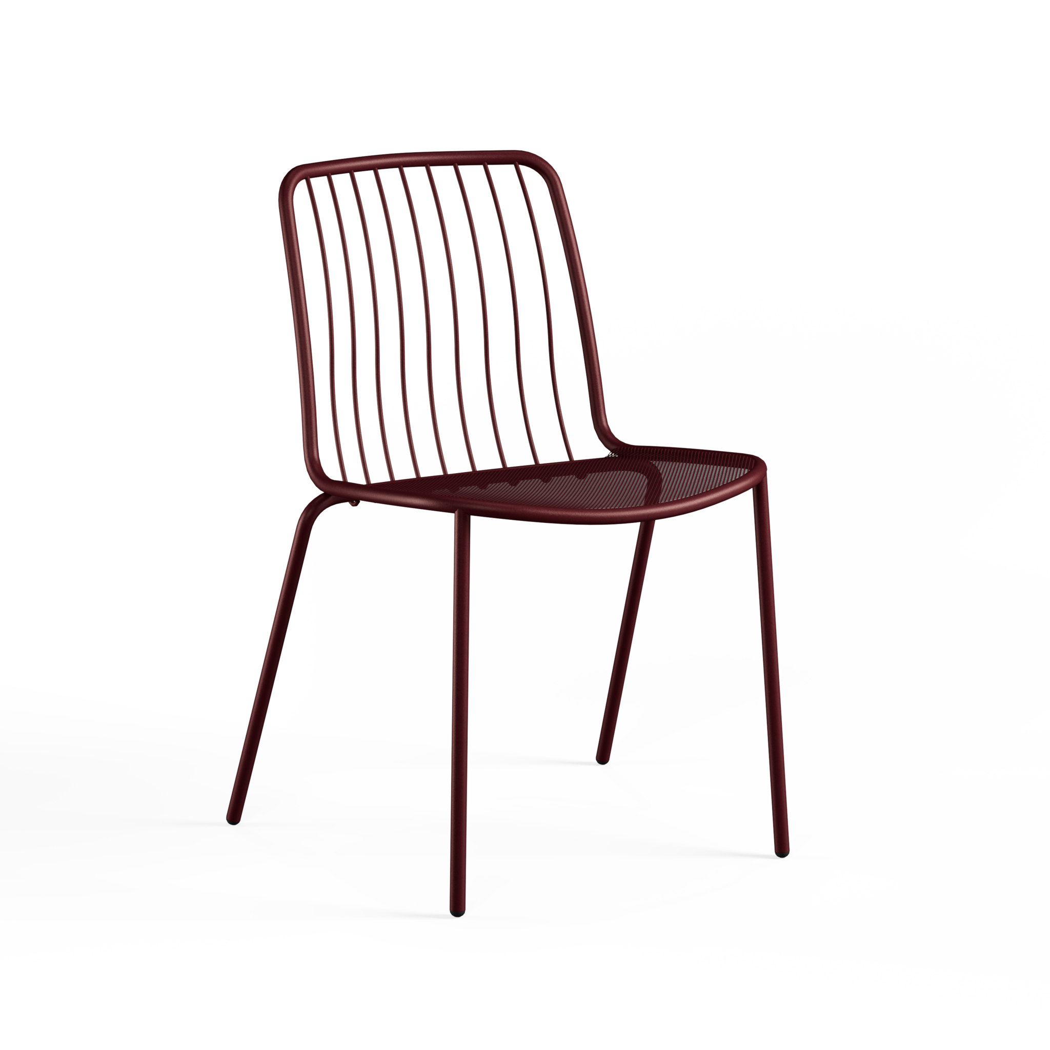 De zitting in stalen mesh zit aangenaam en ventileert vanzelf op warme dagen. De rugleuning is opgebouwd uit slanke metalen spijlen, wat de stoel een open, dynamische look geeft die mooi past bij moderne en contemporary terrassen, maar evengoed bij een meer industrieel buitenconcept.