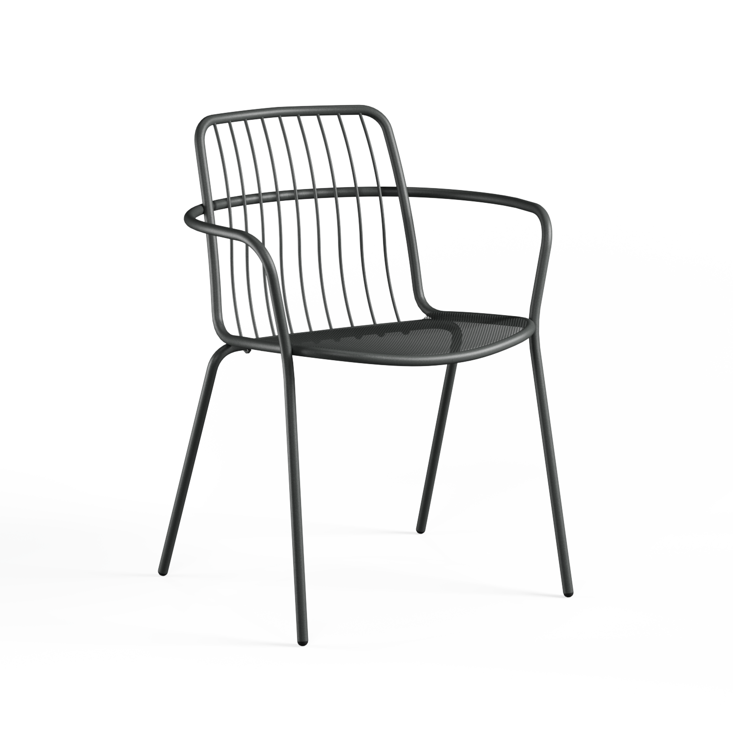 De zitting in stalen mesh laat lucht door en zit comfortabel, ook wanneer de zon goed haar best doet. De rugleuning in slanke metalen spijlen houdt het geheel visueel open en geeft een subtiele dynamiek aan je terras, patio of projectinrichting. De armleuningen maken het zitgevoel net iets relaxter, zonder dat het ontwerp zwaarder oogt.
