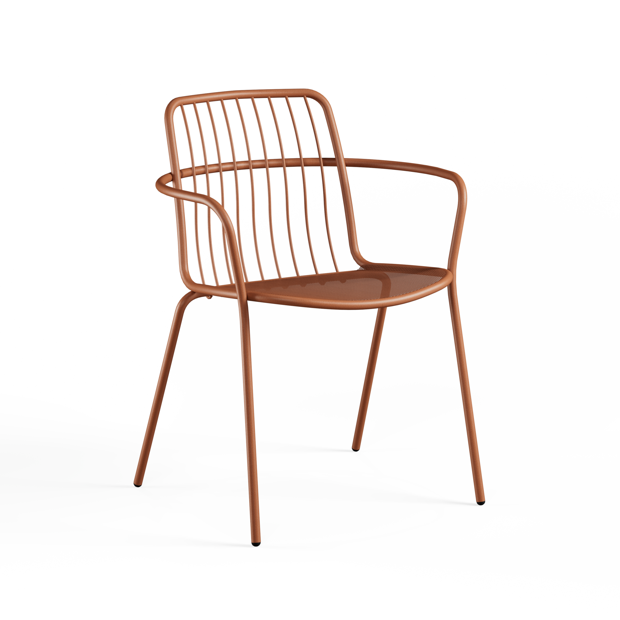 De zitting in stalen mesh laat lucht door en zit comfortabel, ook wanneer de zon goed haar best doet. De rugleuning in slanke metalen spijlen houdt het geheel visueel open en geeft een subtiele dynamiek aan je terras, patio of projectinrichting. De armleuningen maken het zitgevoel net iets relaxter, zonder dat het ontwerp zwaarder oogt.