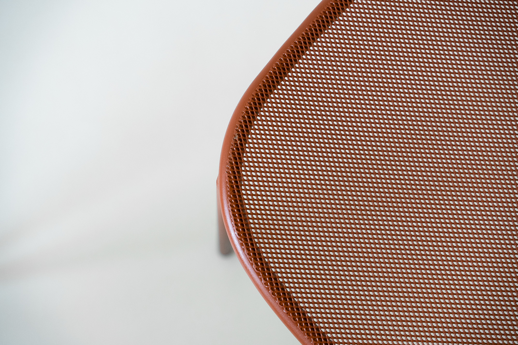 De zitting in stalen mesh laat lucht door en zit comfortabel, ook wanneer de zon goed haar best doet. De rugleuning in slanke metalen spijlen houdt het geheel visueel open en geeft een subtiele dynamiek aan je terras, patio of projectinrichting. De armleuningen maken het zitgevoel net iets relaxter, zonder dat het ontwerp zwaarder oogt.