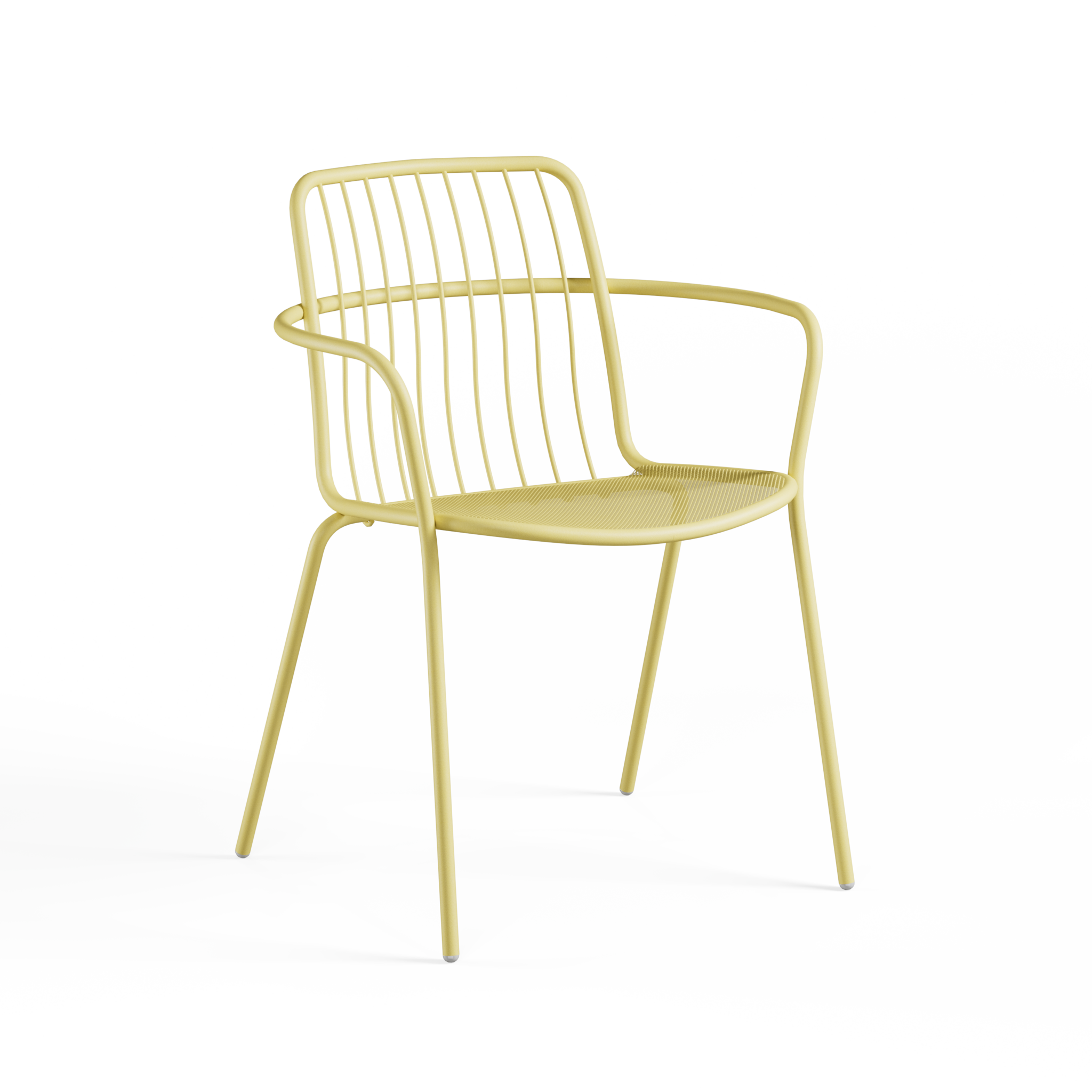 Dankzij de combinatie van gebogen stalen lijnen en stalen mesh is Alisea gebouwd voor intensief gebruik in horeca of publieke ruimtes, maar hij voelt zich evengoed thuis aan een lange tafel in de tuin. En met de frisse tint vanilla yellow voeg je meteen kleur toe, zonder dat het schreeuwerig wordt.