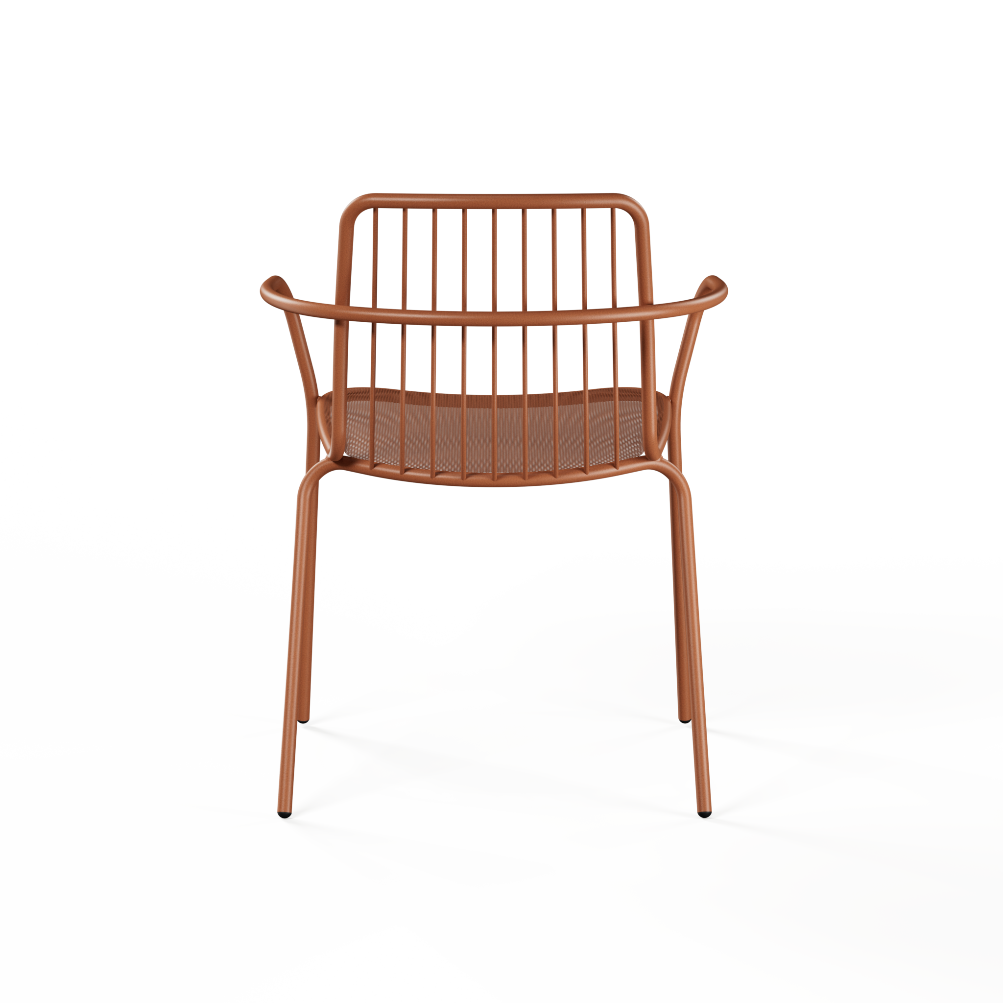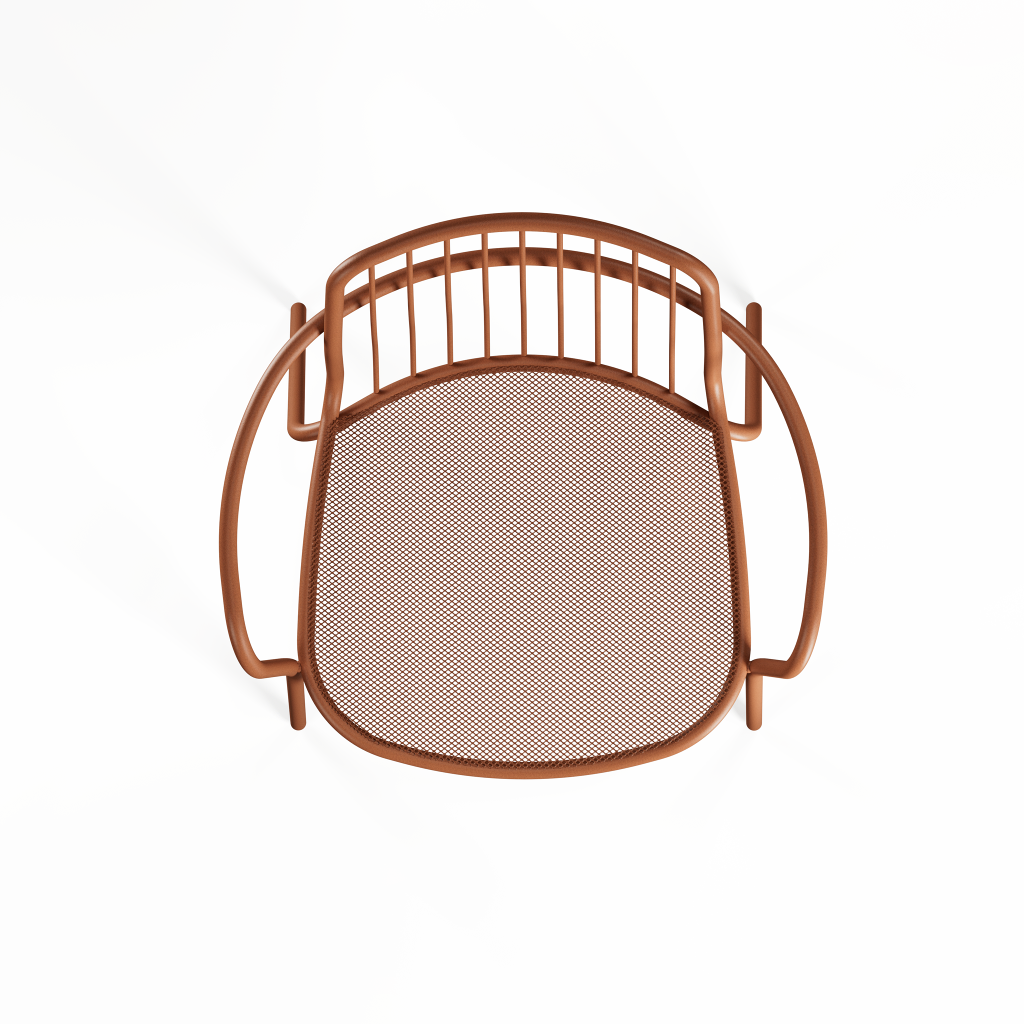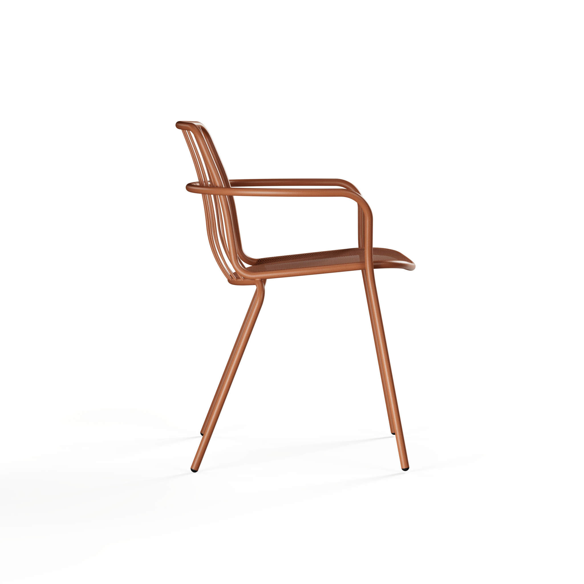 De zitting in stalen mesh laat lucht door en zit comfortabel, ook wanneer de zon goed haar best doet. De rugleuning in slanke metalen spijlen houdt het geheel visueel open en geeft een subtiele dynamiek aan je terras, patio of projectinrichting. De armleuningen maken het zitgevoel net iets relaxter, zonder dat het ontwerp zwaarder oogt.