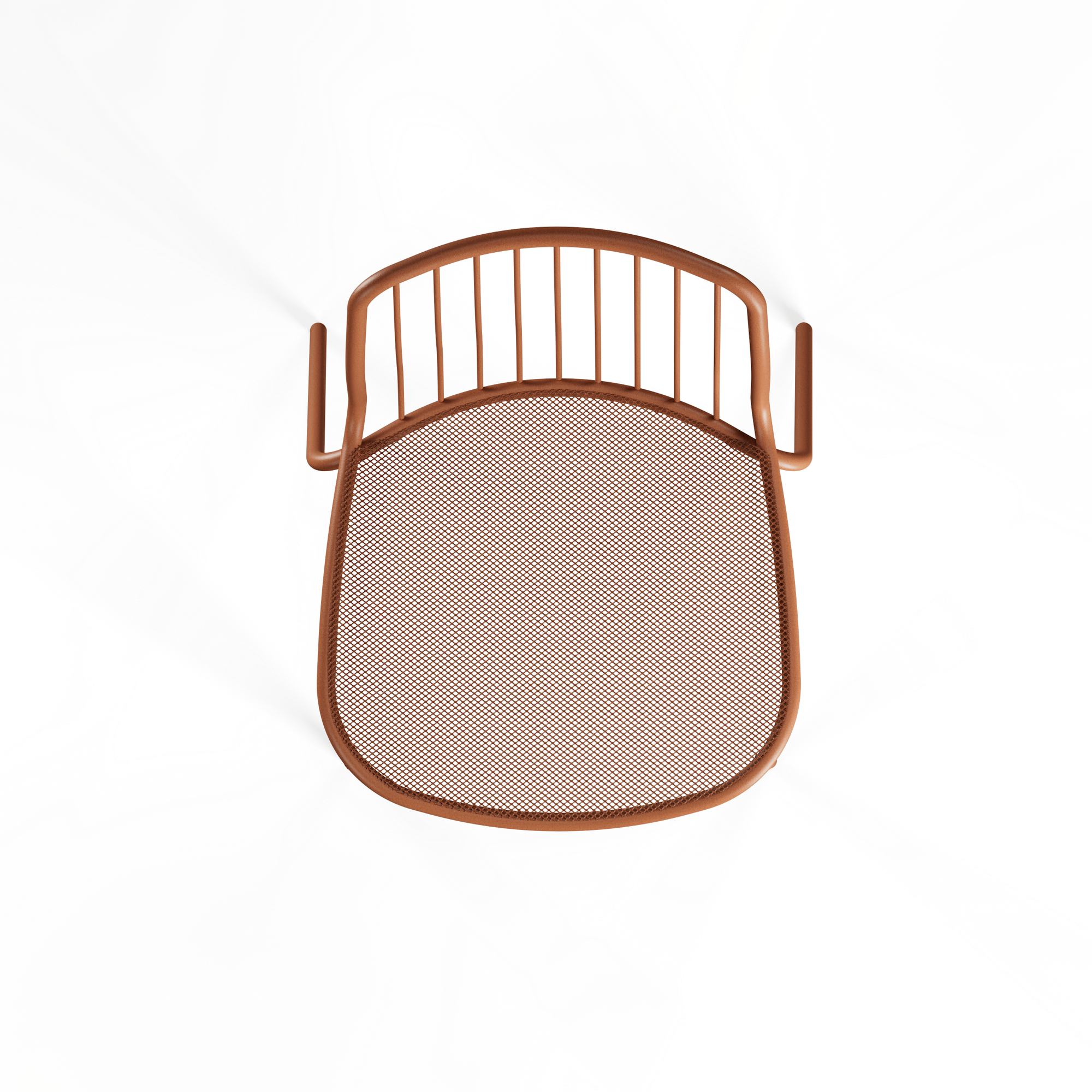 De zitting in stalen mesh zit aangenaam en ventileert vanzelf op warme dagen. De rugleuning is opgebouwd uit slanke metalen spijlen, wat de stoel een open, dynamische look geeft die mooi past bij moderne en contemporary terrassen, maar evengoed bij een meer industrieel buitenconcept.