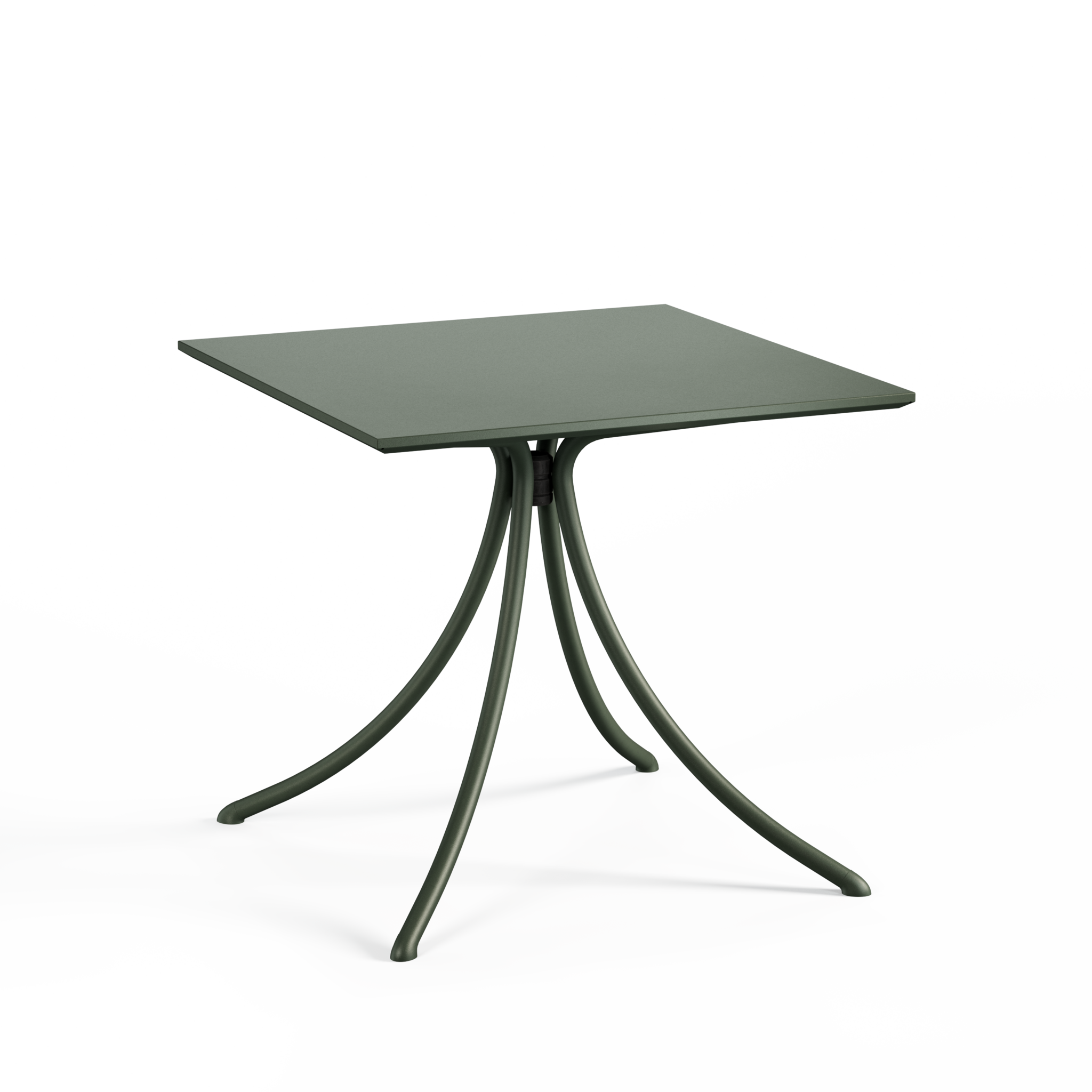 Het frame bestaat uit stalen buizen, het tafelblad uit heet-gegalvaniseerd massief staal met een netjes gevouwen rand. Dat is geen toeval: de gevouwen rand geeft het blad extra stevigheid en zorgt voor een afgewerkte uitstraling die je van veraf al herkent. Military green is een kleur die nergens om vraagt maar altijd past: subtiel, aards en op een prettige manier tijdloos.