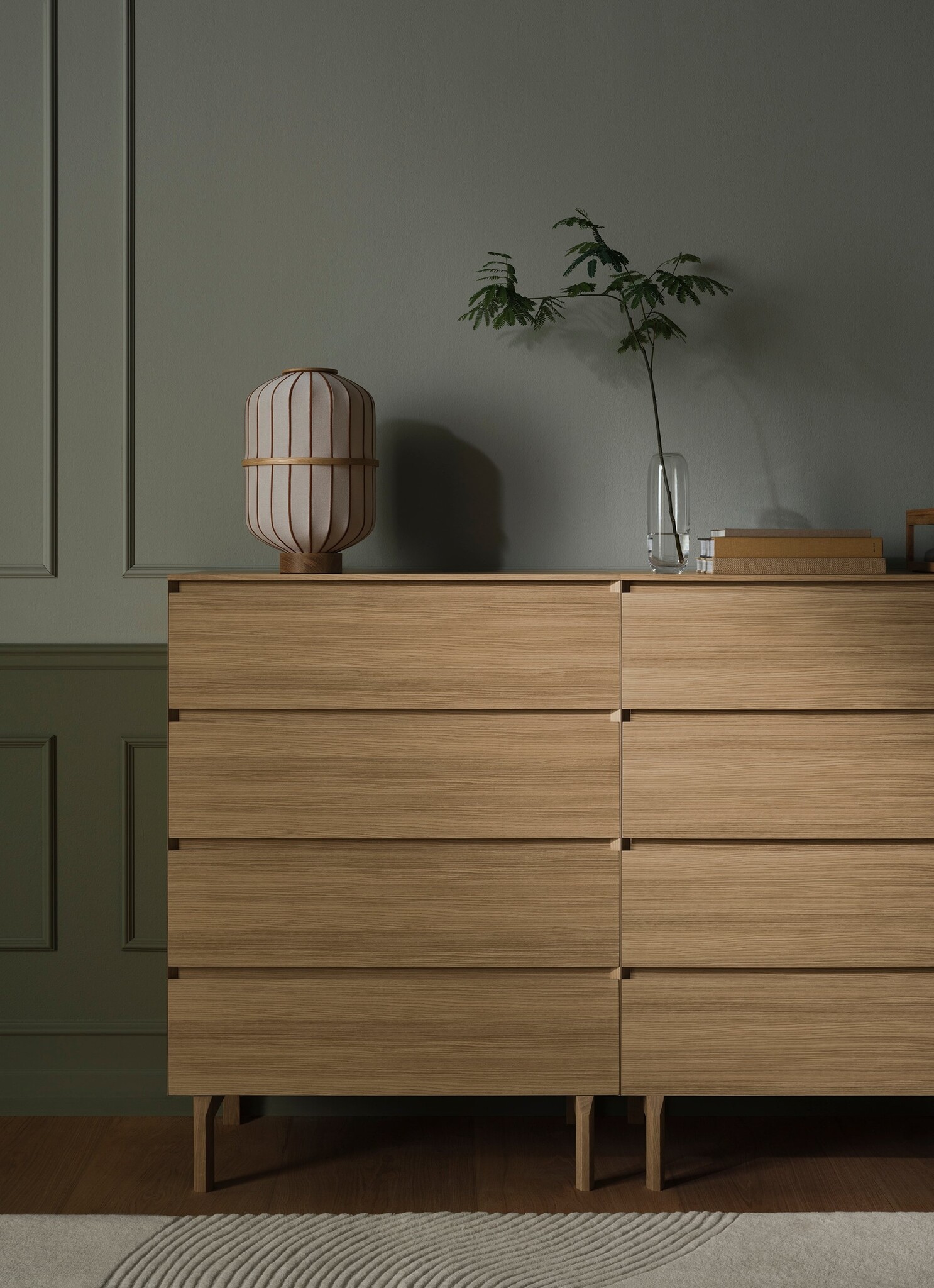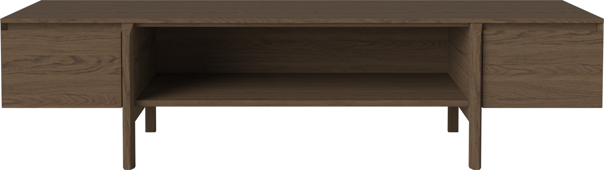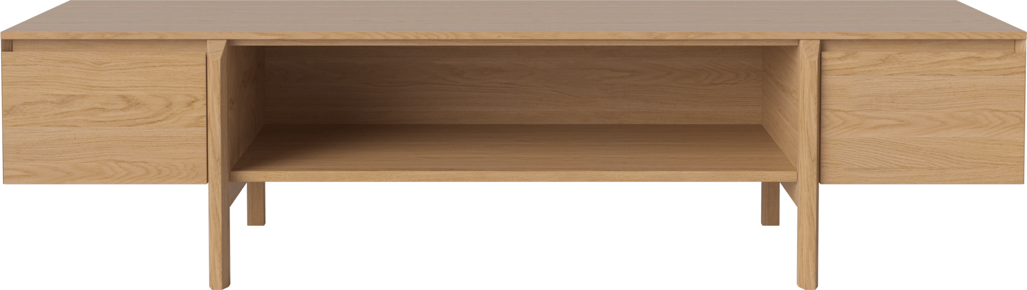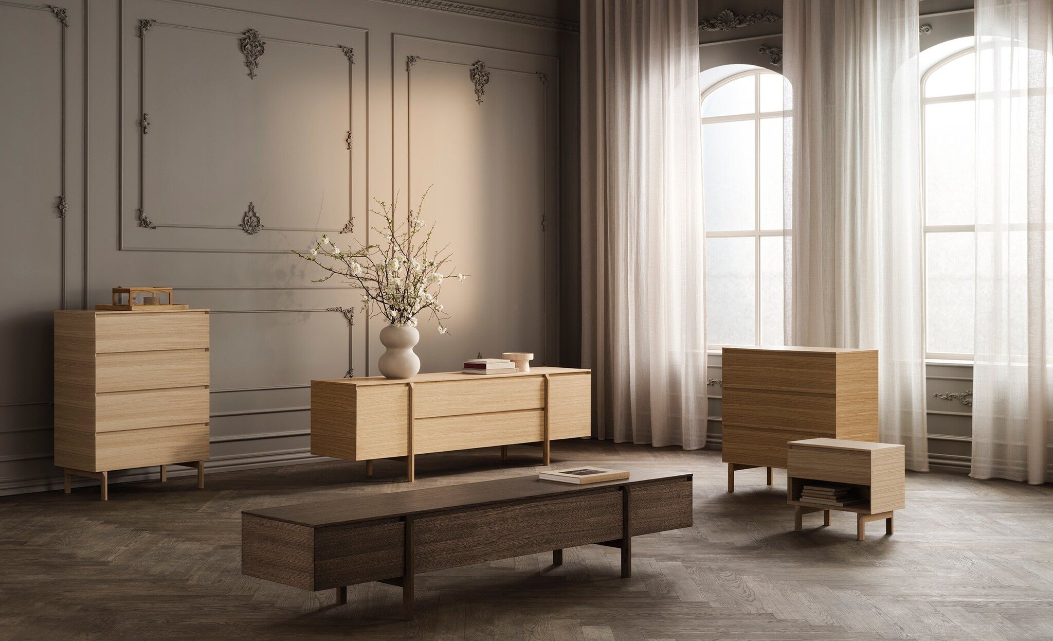 De geometrie is subtiel maar sterk: open ruimtes en/of laden vormen een strak lijnenspel rond twee verticale poten. Het resultaat is een opbergmeubel dat niet alleen mooi “staat”, maar ook logisch werkt in het dagelijks gebruik. Ideaal als tv-kast, als lage wandkast in de leefruimte of als ruim dressoir in een open eetkamer.