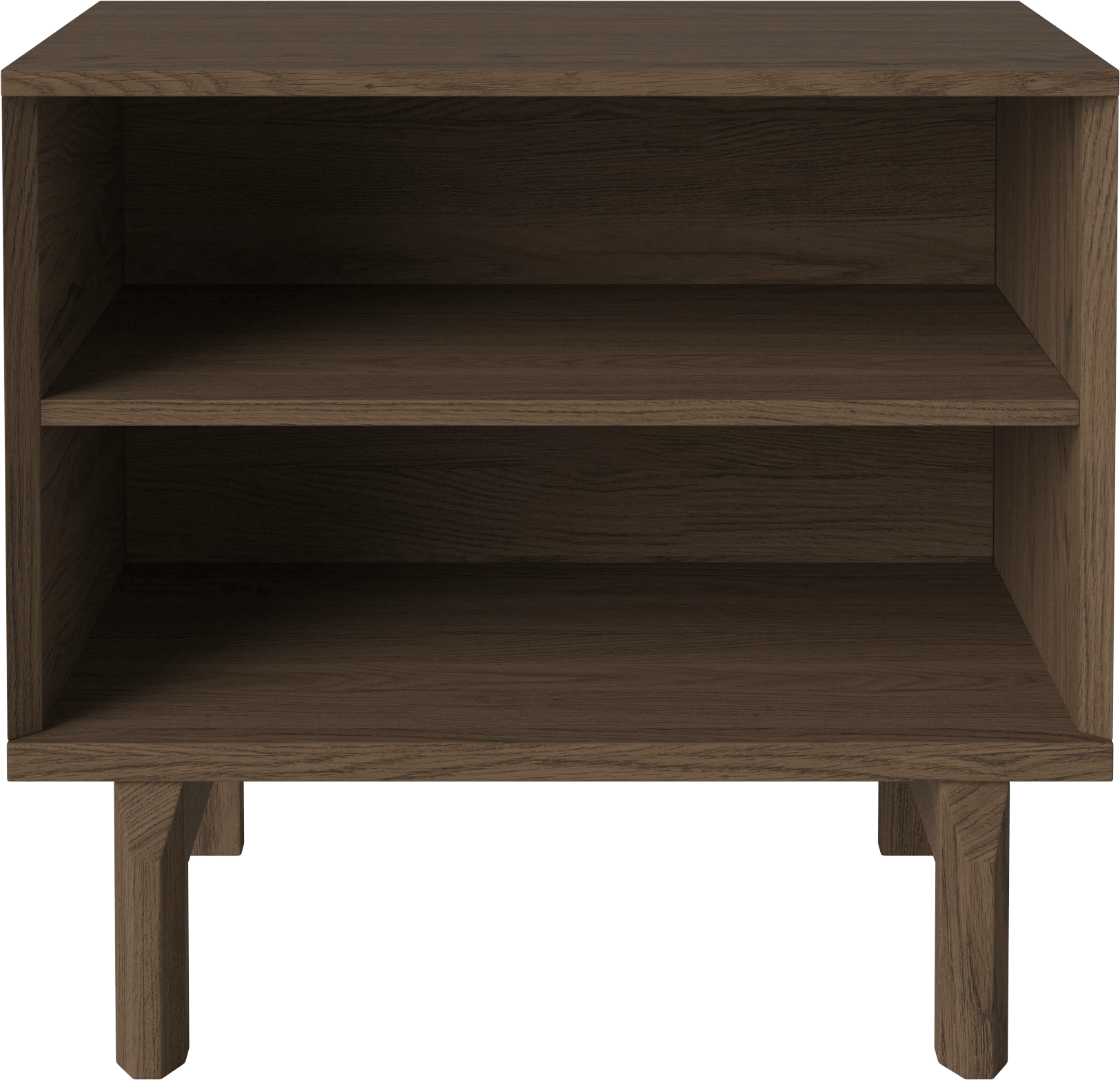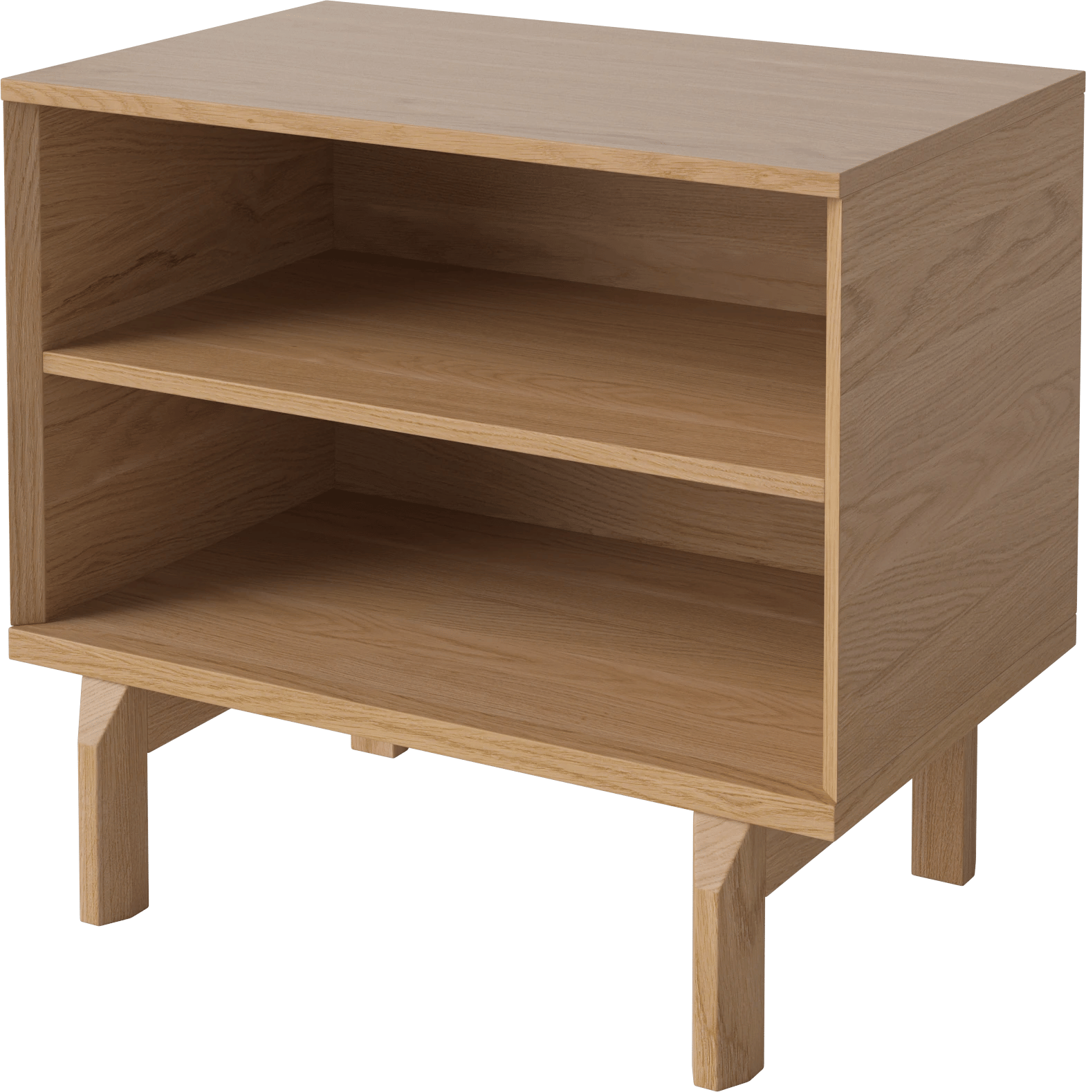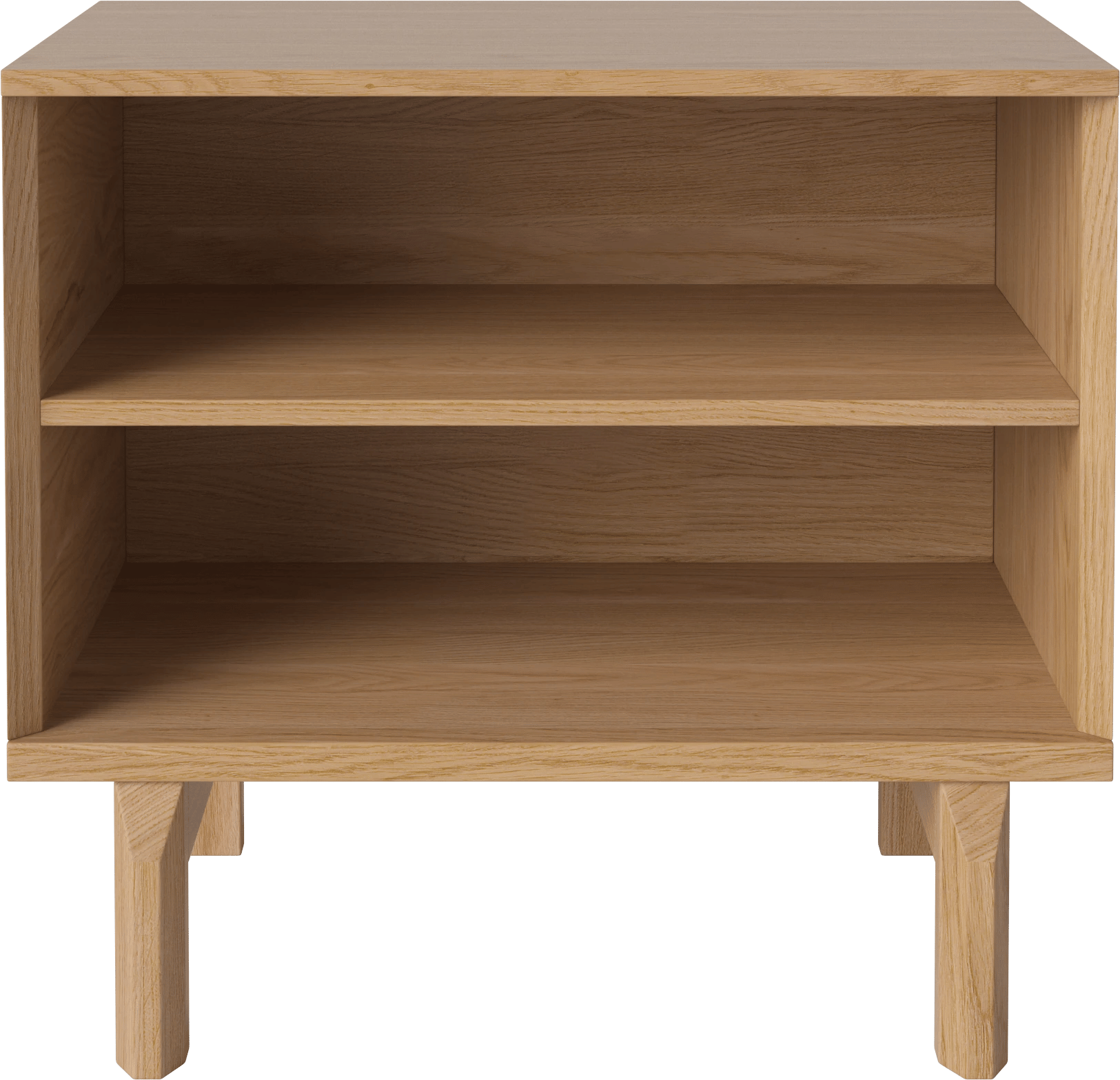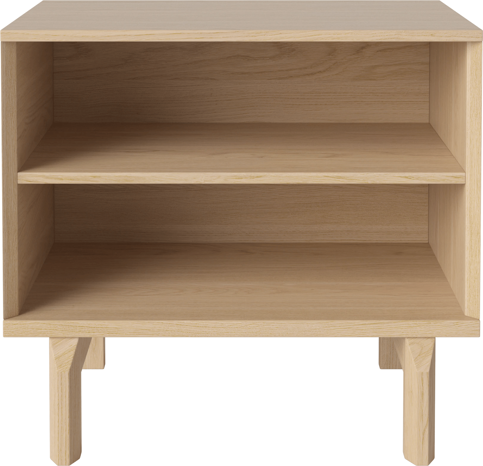 De afwerking in geolied eikenfineer geeft het hout een zachte, lichte uitstraling, zonder het karakter weg te poetsen. De geometrie zit in de details: open ruimte en lade vormen samen een helder geheel rond de twee verticale poten. Praktisch, maar nooit druk.