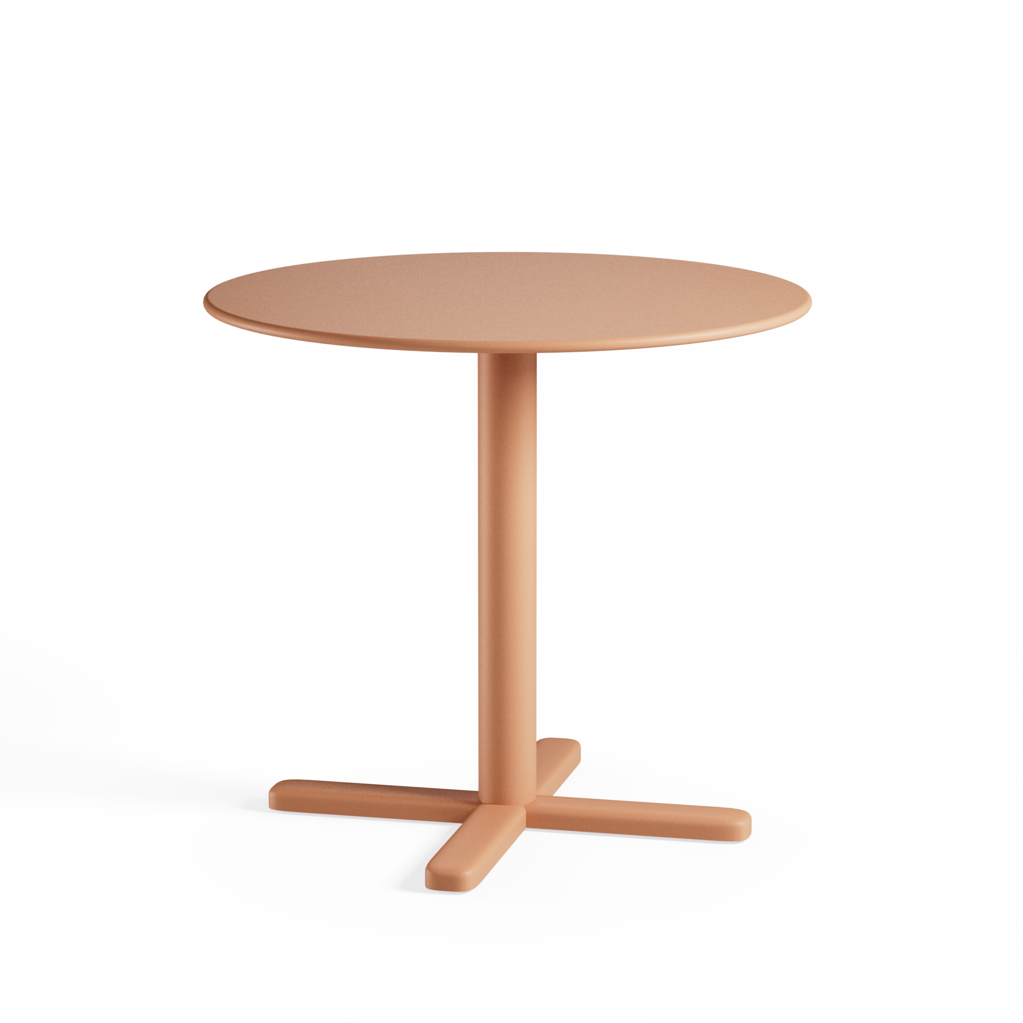 Het ronde blad is gemaakt uit thermisch verzinkt staal. Dat betekent: extra weerstand tegen roest én een oppervlak dat je eenvoudig proper houdt. De kruispoot geeft de tafel een stabiele basis zonder dat je met vier poten op elke hoek zit te puzzelen met stoelen.