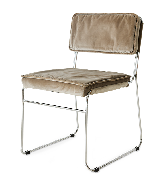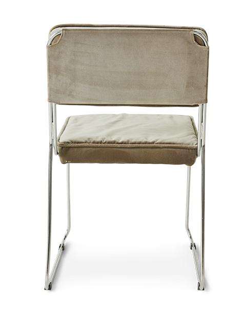 De fluwelen bekleding geeft de stoel een warme, luxueuze uitstraling. De Dirty Chai kleur — een zachte, aardse groentint — zorgt voor diepte zonder zwaar te worden. Een tint die zich moeiteloos laat combineren met hout, metaal en neutrale kleuren.