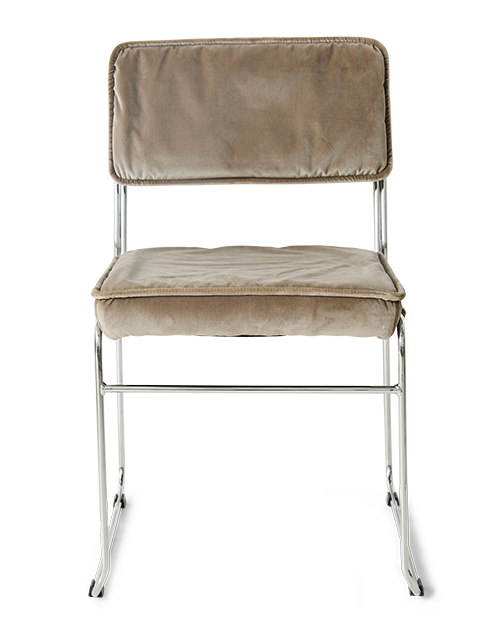 | Materiaal | Frame in verchroomd staal met zitting in multiplex, schuimvulling en fluwelen bekleding (95% polyester, 5% katoen) |