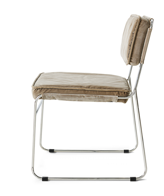 Het slanke onderstel in verchroomd staal vormt een mooi contrast met de zachte zitting. Het geeft de stoel een lichte, moderne uitstraling en zorgt tegelijk voor stabiliteit.