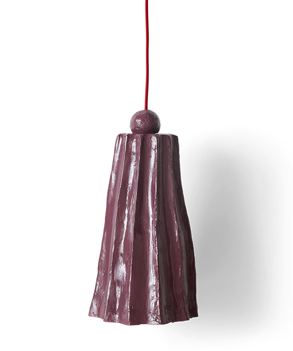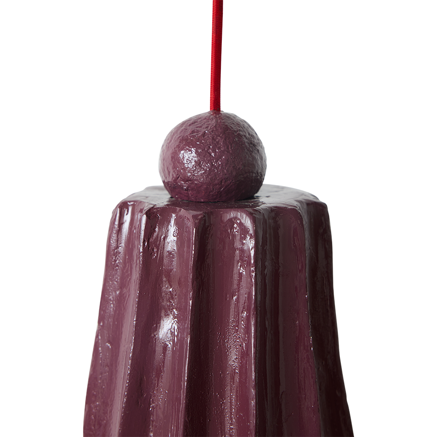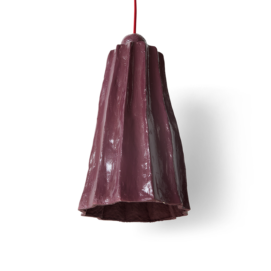 Gemaakt uit katoen mâché voelt deze design hanglamp licht en ambachtelijk aan, met een bijna handgemaakte uitstraling. De organische vorm en matte afwerking geven het geheel een rustige, natuurlijke look, terwijl de diepe kleur zorgt voor een krachtig accent in de ruimte.