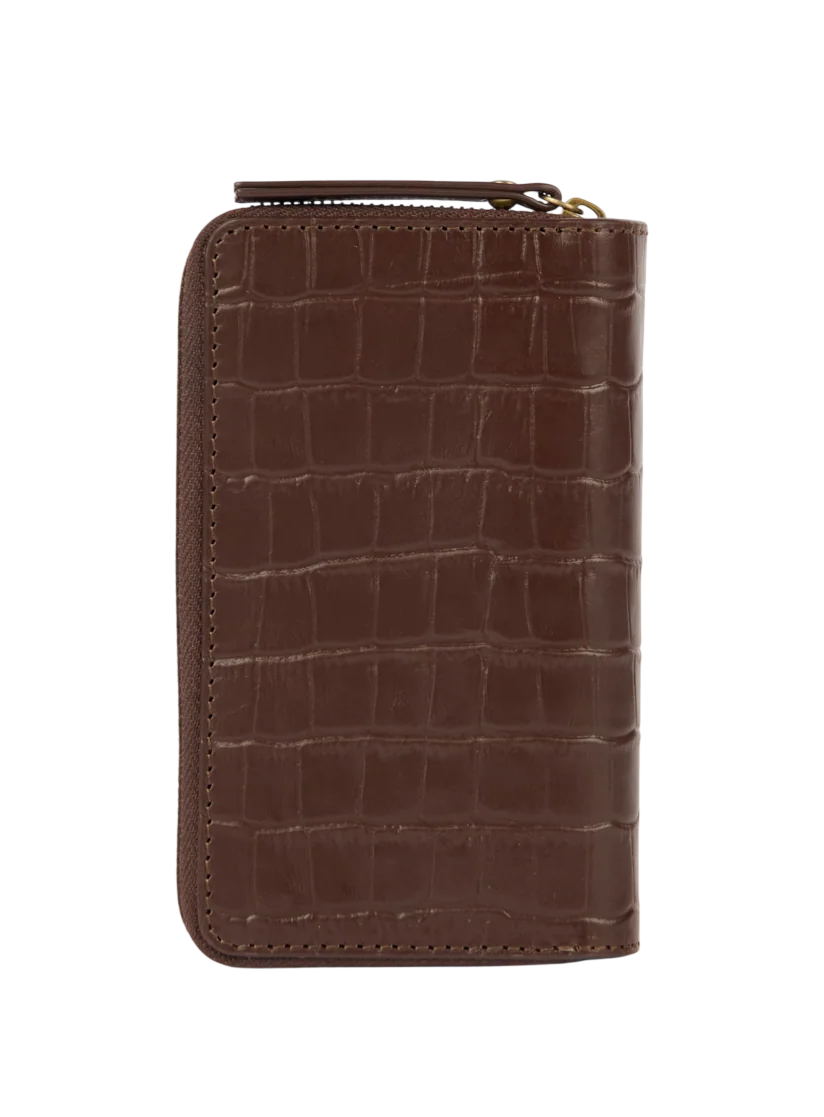 Stijlvol en ingetogen: de Jett Wallet in chocoladebruin croco-print leder brengt rust, textuur en functionaliteit samen in één compact ontwerp. De croco-structuur geeft de portefeuille een luxueuze uitstraling, terwijl de warme kleur haar tijdloos houdt.