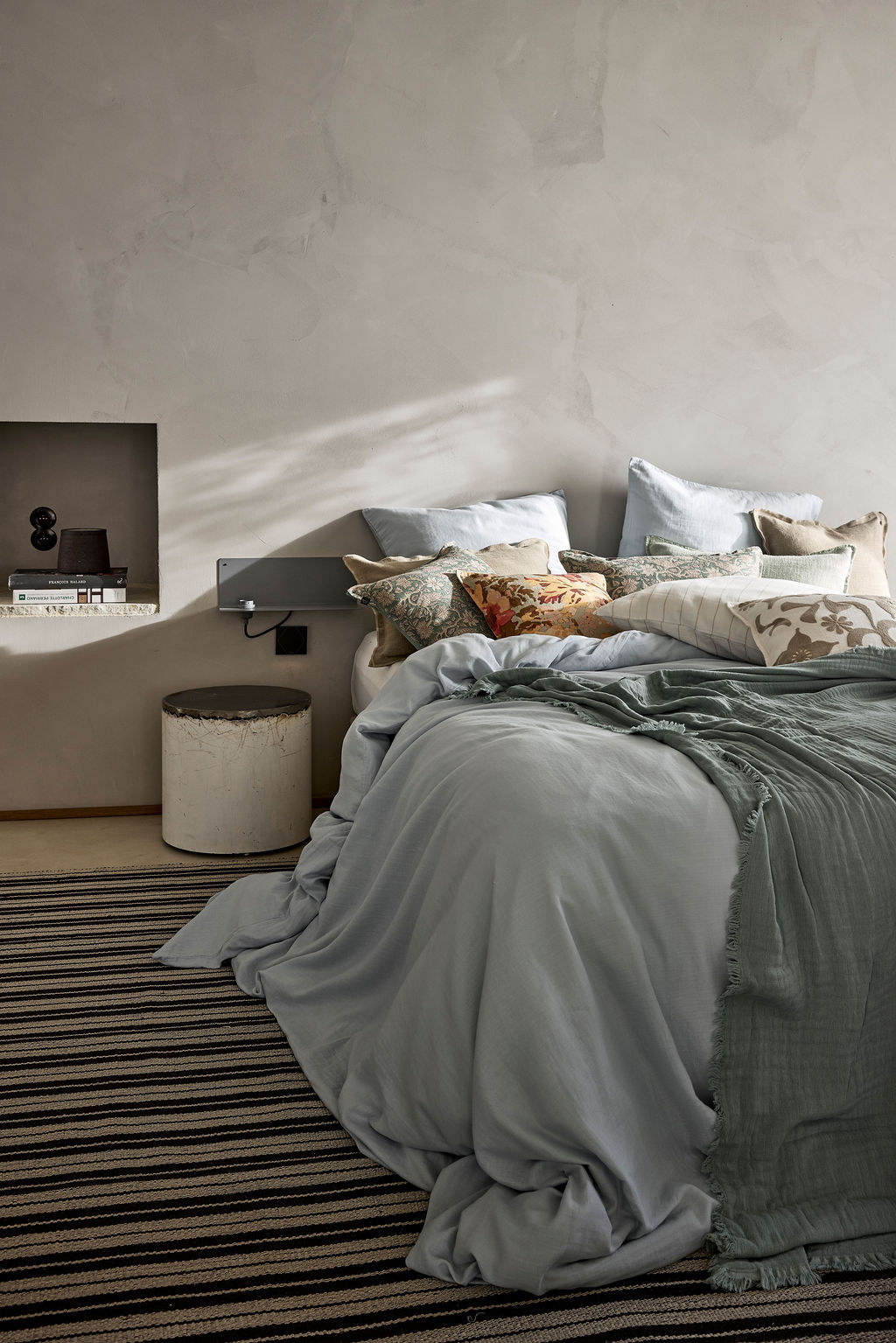 De stof is Double gauze washed percale cotton: een gewassen katoenstructuur met een zachte, licht gekreukte uitstraling. Dat maakt deze kussenslopen ideaal voor wie houdt van nonchalante elegantie (en geen zin heeft om alles kaarsrecht te strijken).