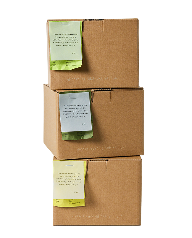 Vier handgeblazen wijnglazen in warme citrinetint, ontworpen door glaskunstenares Nienke Sikkema voor HKliving. Elk glas is uniek van vorm en gewicht, een object dat je opmerkt en vasthoudt. Lees meer