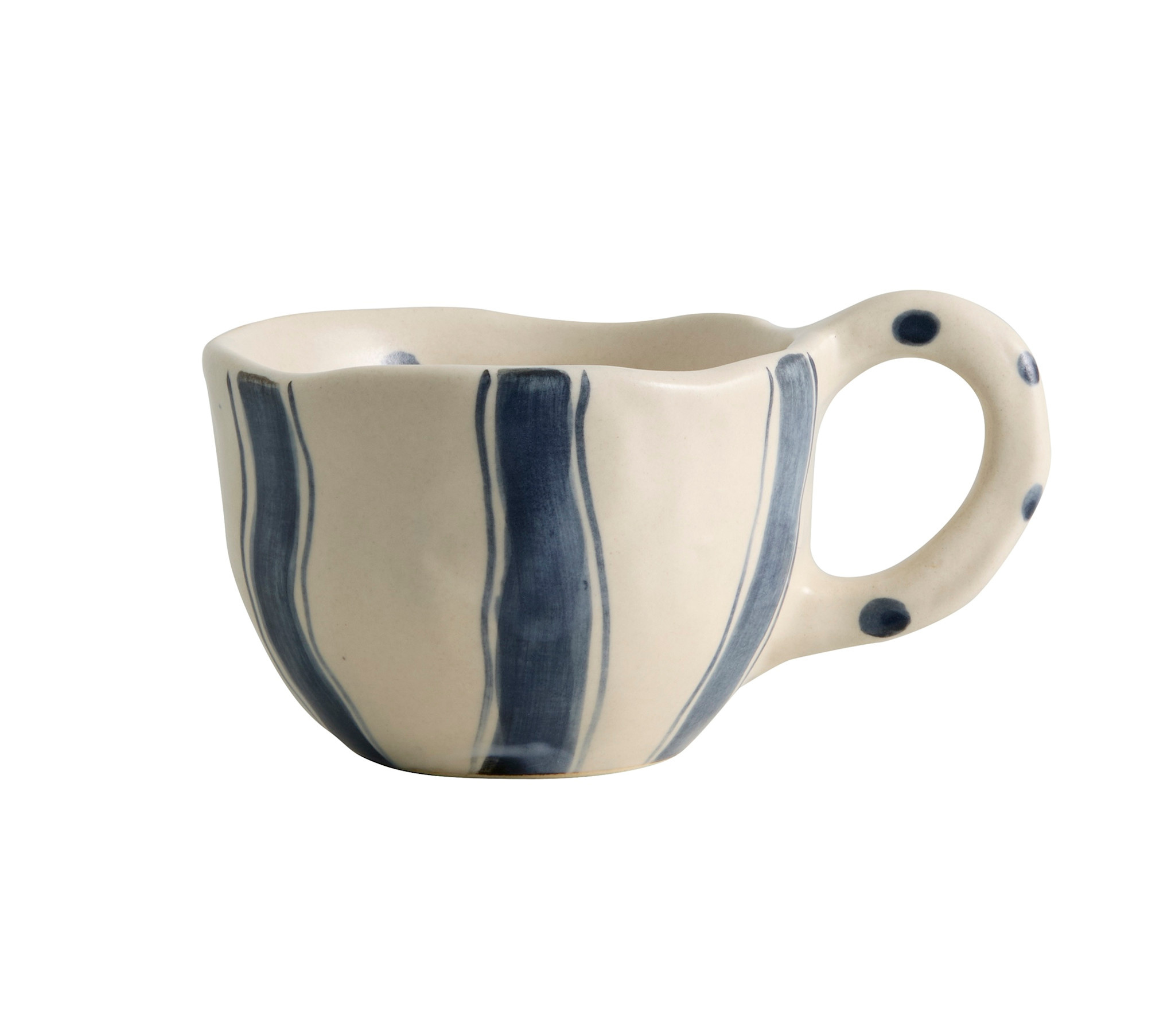 De Gogi koffiekop van Nordal uit de Atelier FORMA-collectie voelt tegelijk speels en rustig. Blauwe, handgeschilderde strepen en stippen zorgen voor een levendig accent, zonder schreeuwerig te worden. Het resultaat: een kop die modern oogt, maar ook moeiteloos in een tijdloze tafelsetting past.