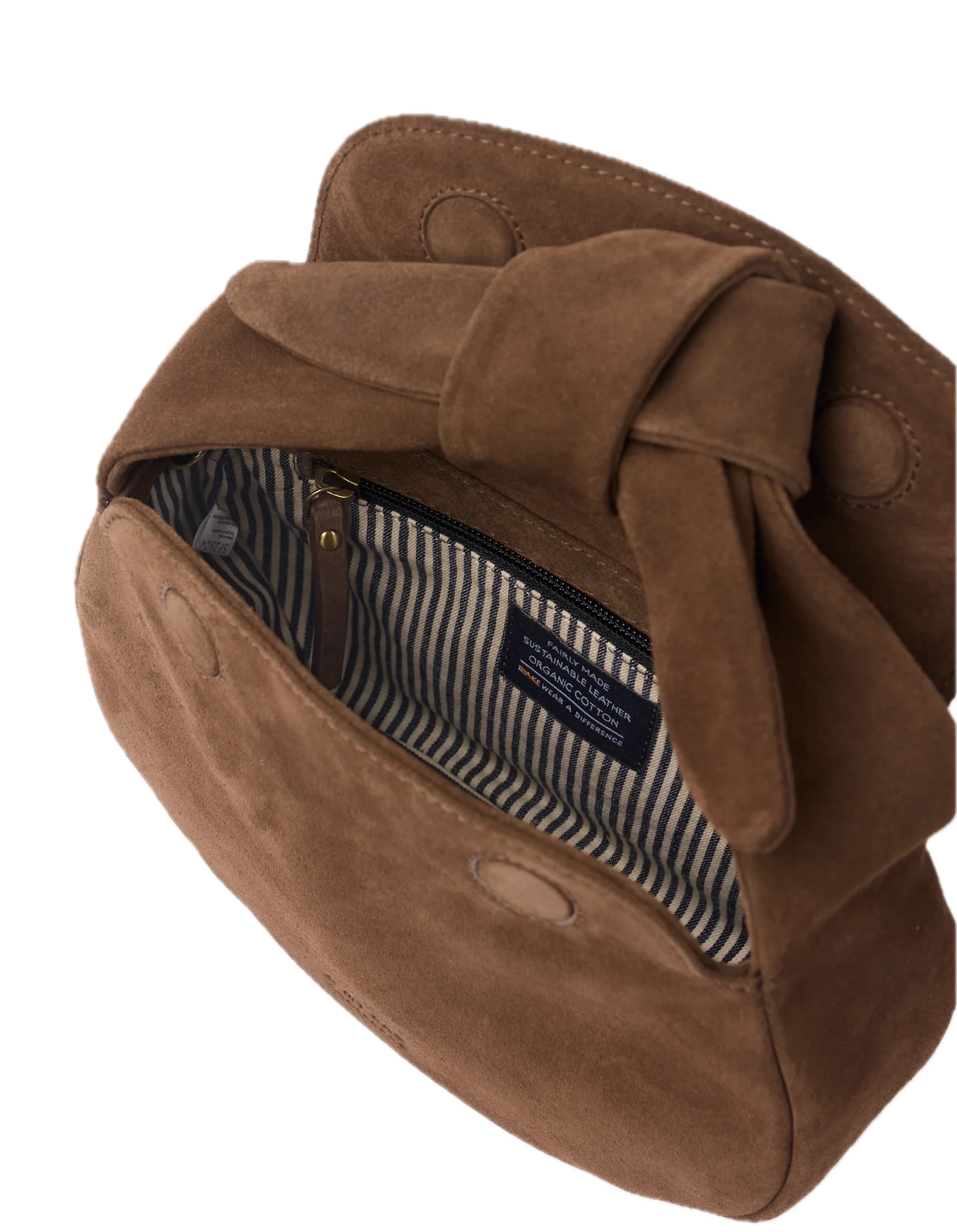 | Materiaal | Deze handtas is gemaakt van chroomvrij gelooid suède, gecombineerd met Classic Leather voor extra structuur. Binnenin is de tas afgewerkt met een voering in OCS- en GRS-gecertificeerd katoen en details in antiek messing. |