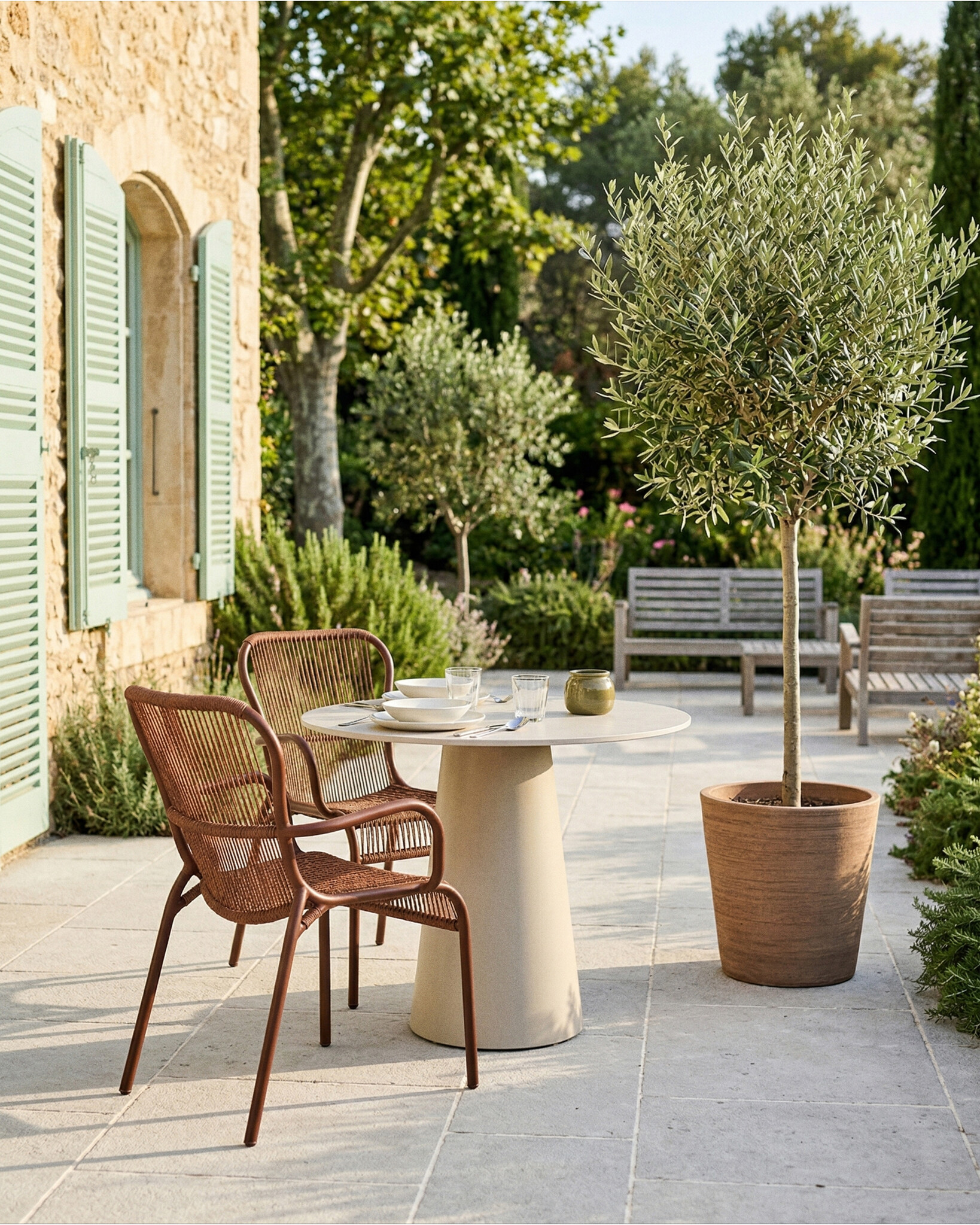 De Sandro dining table round Ø150 van Vincent Sheppard is gemaakt voor buitenmomenten die spontaan uitlopen. Het ronde keramieken blad in Portland heeft een zachte, steenachtige look die mooi combineert met groen, hout en textiel, zonder dat je terras plots “te strak” wordt.
